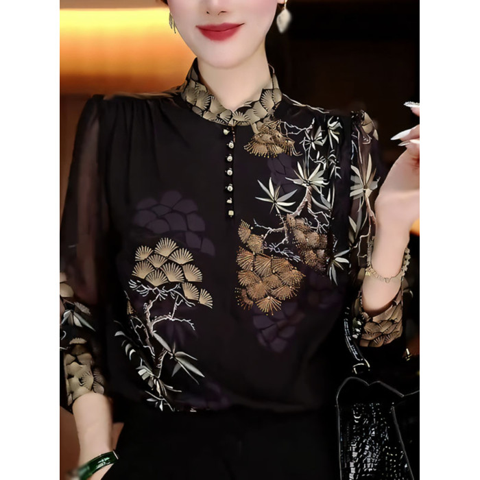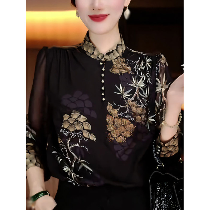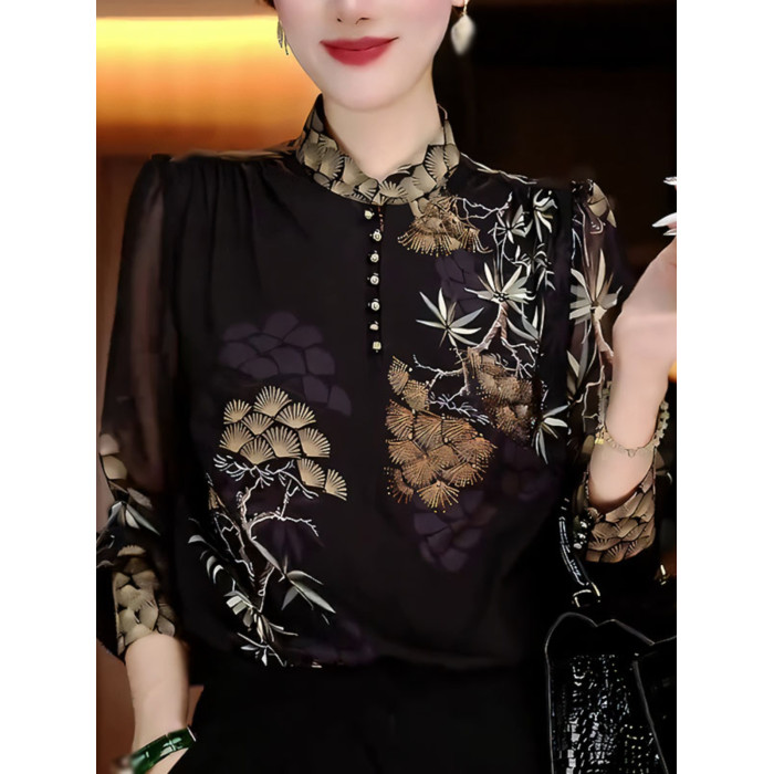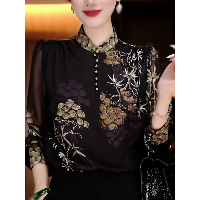2025年夏季新款國風復古氣質立領長袖襯衫大碼女裝胖mm印花打底衫