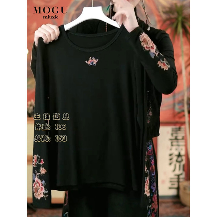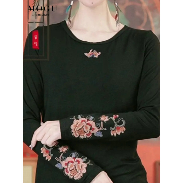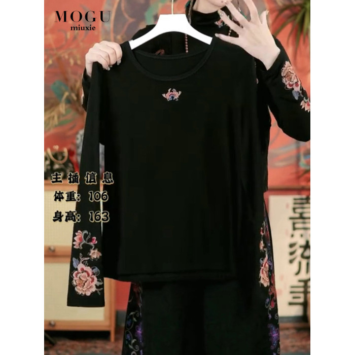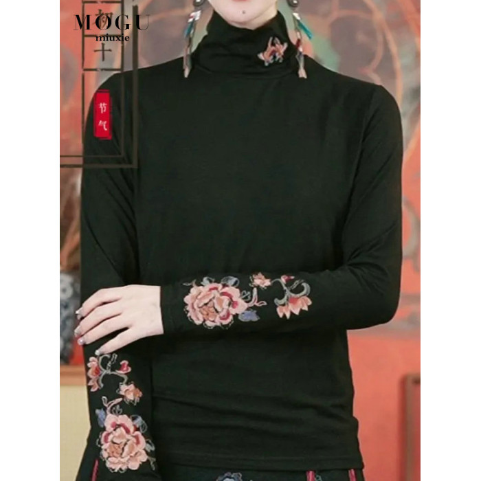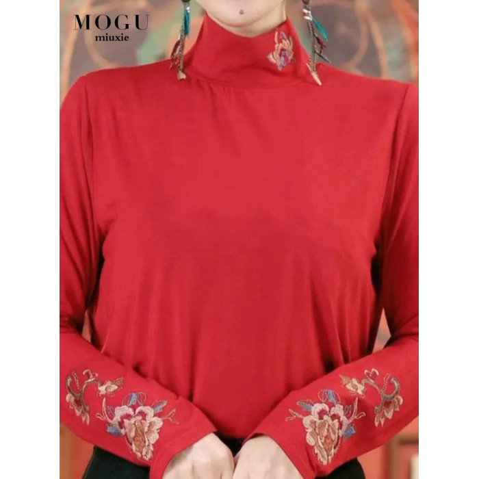 秋款新中式國風刺綉百搭半高領小衫中年媽媽復古顯瘦彈力打底衫
