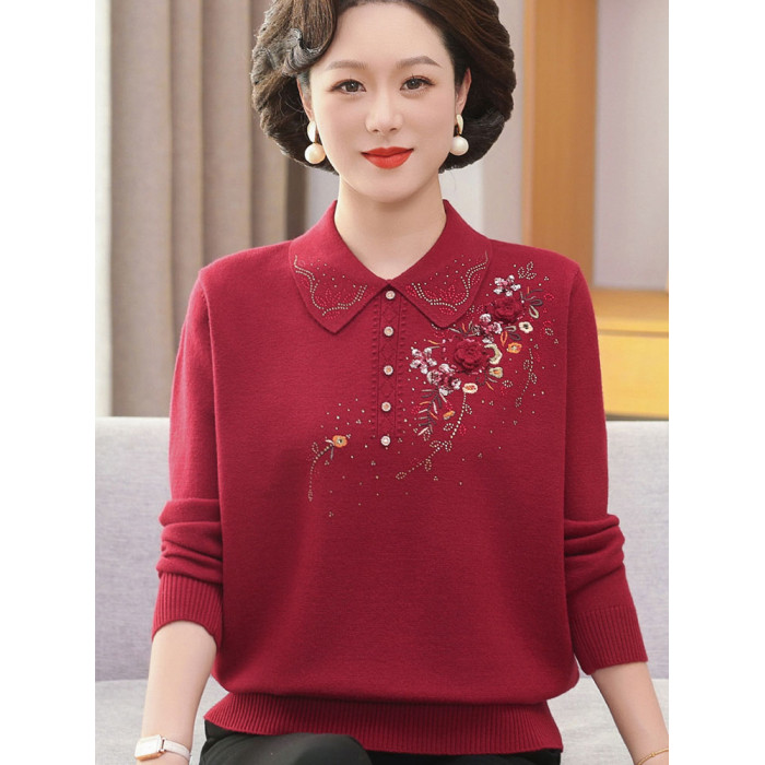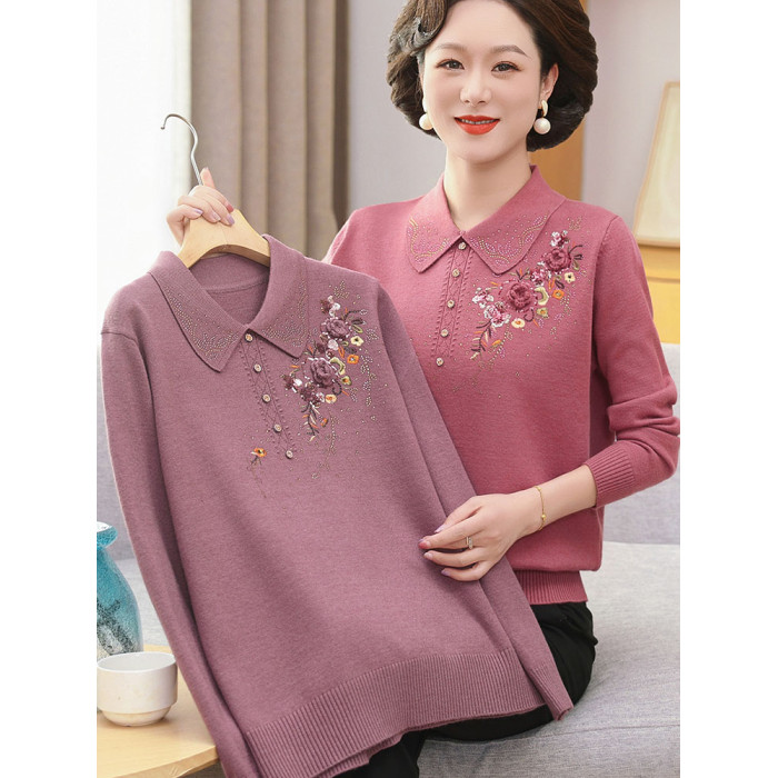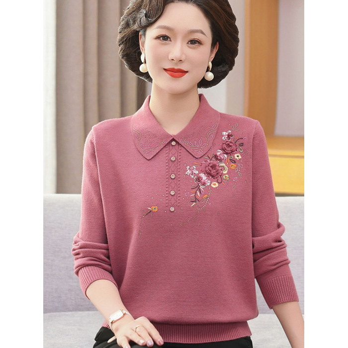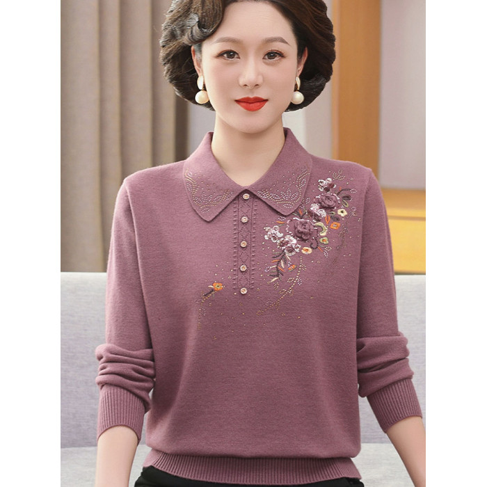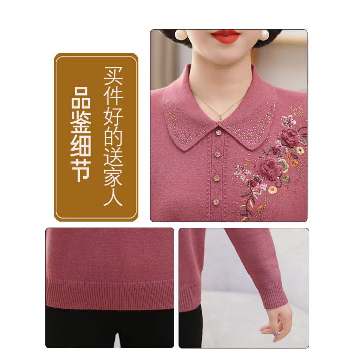 中年媽媽針織打底衫翻領洋氣上衣服中老年女春裝長袖毛衣兩件套薄
