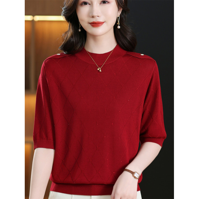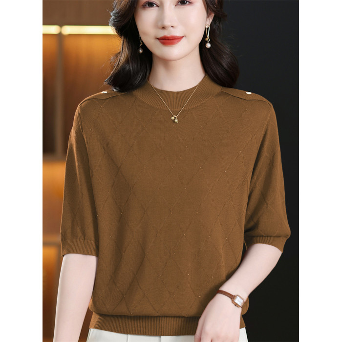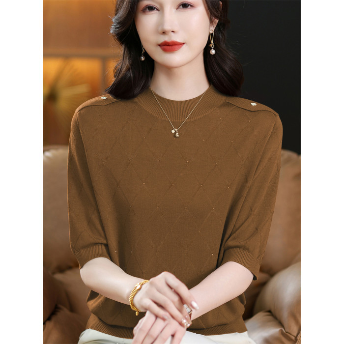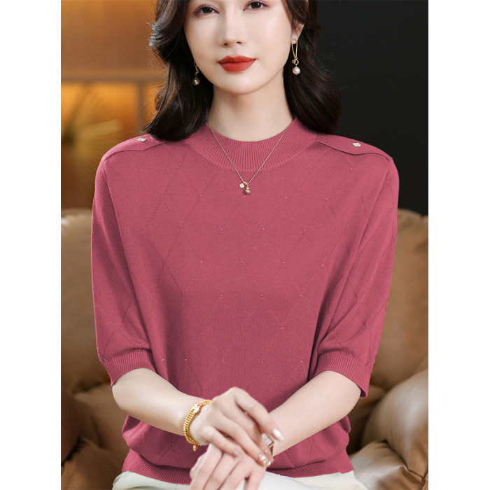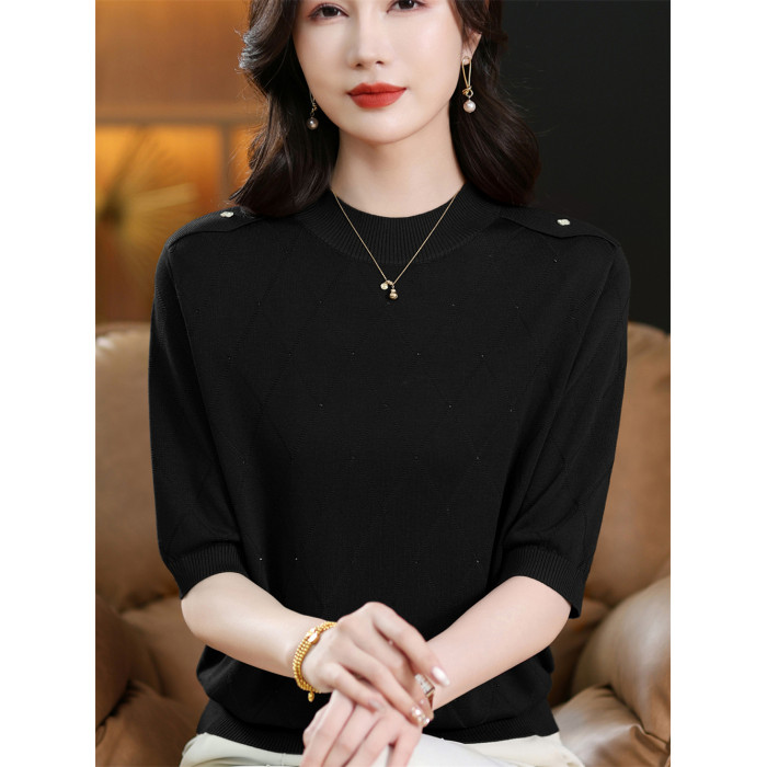 時尚中老年輕媽媽裝新款半高領套頭短袖五分袖洋氣夏薄打底衫上衣