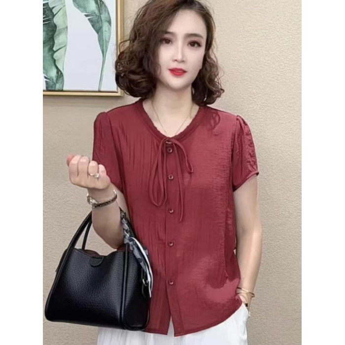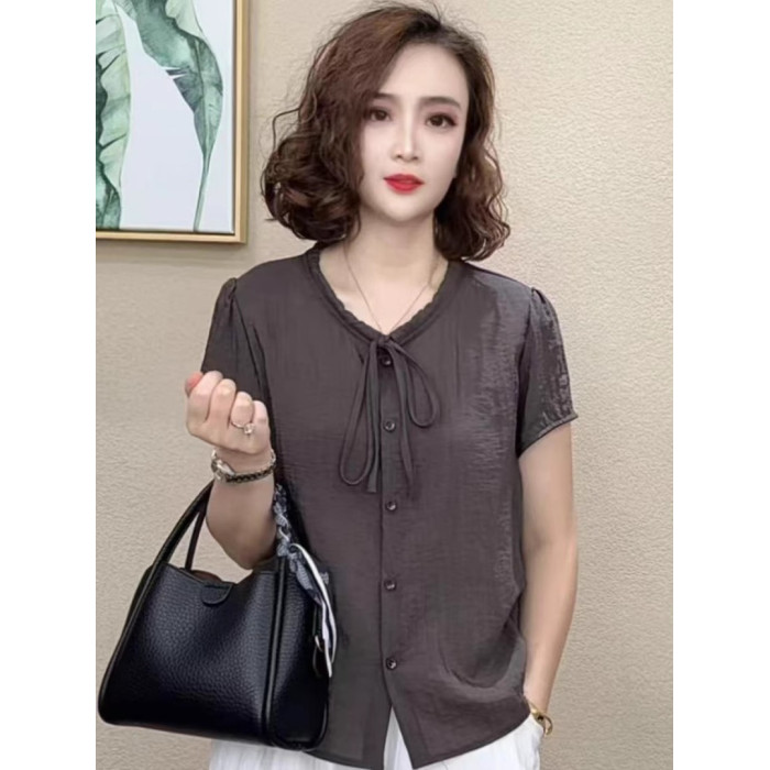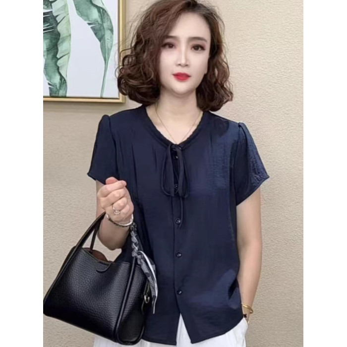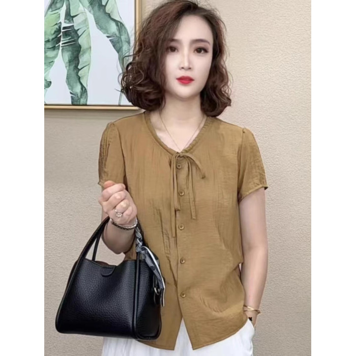 夏季新款純色V領系帶短袖小衫2025時尚媽媽裝T恤顯瘦遮肚減齡上衣