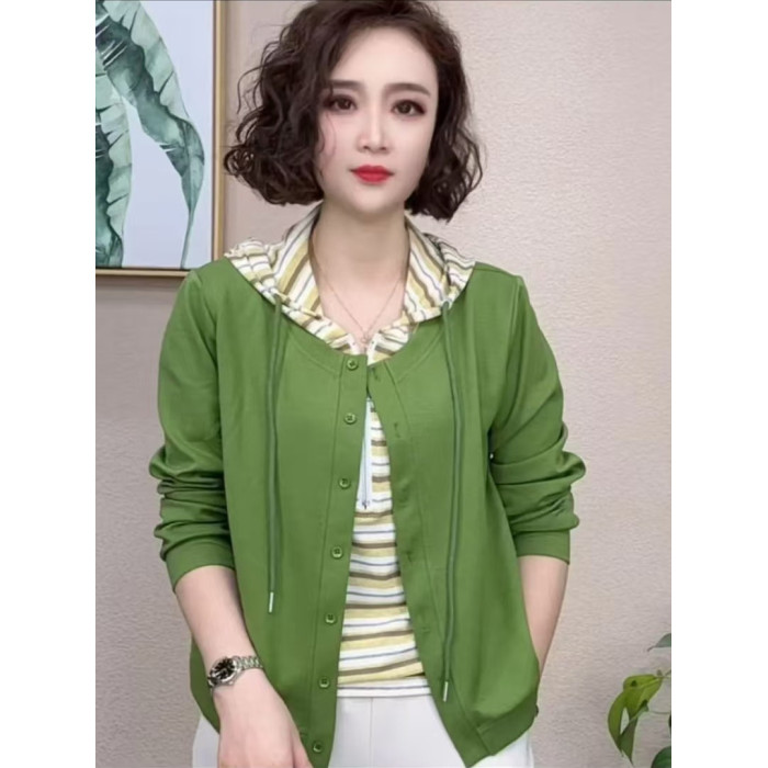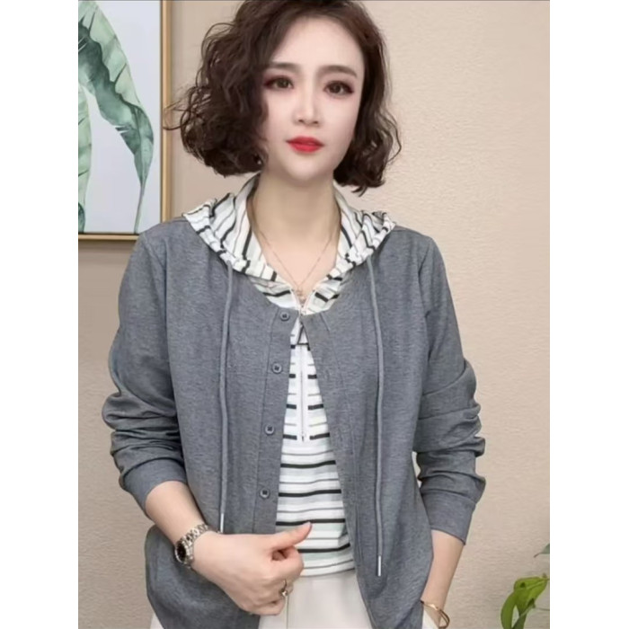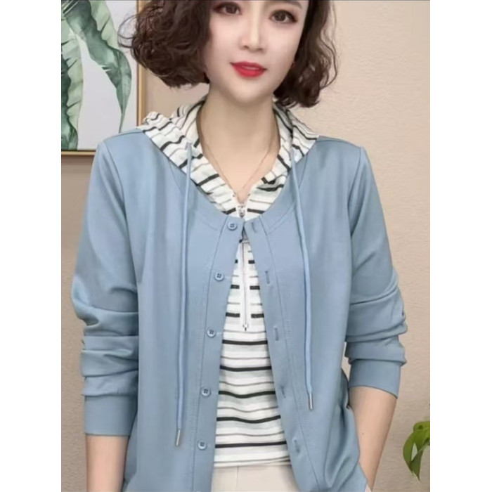 2025春秋新款時尚氣質洋氣休閒百搭小衫連帽女士假兩件長袖打底衫