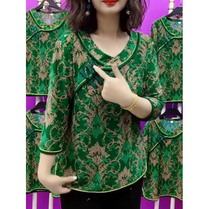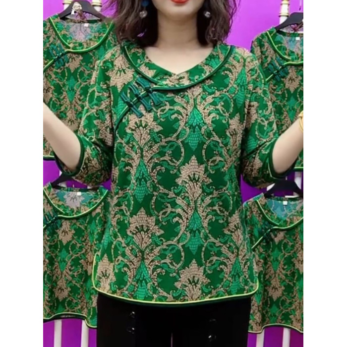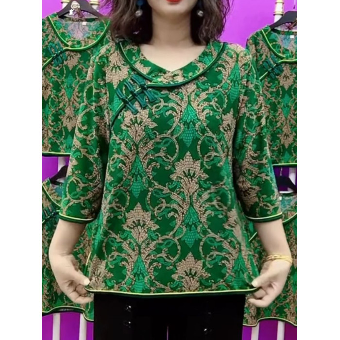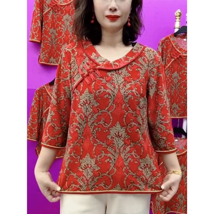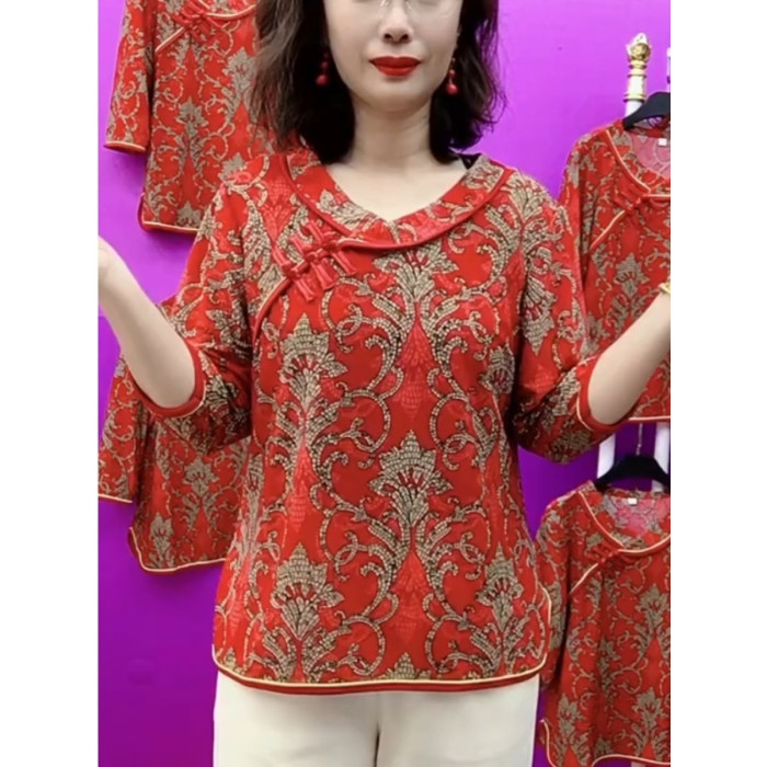 薄款夏季中老年寬松印花媽媽裝顯瘦打底衫民族風盤釦七分袖小衫潮