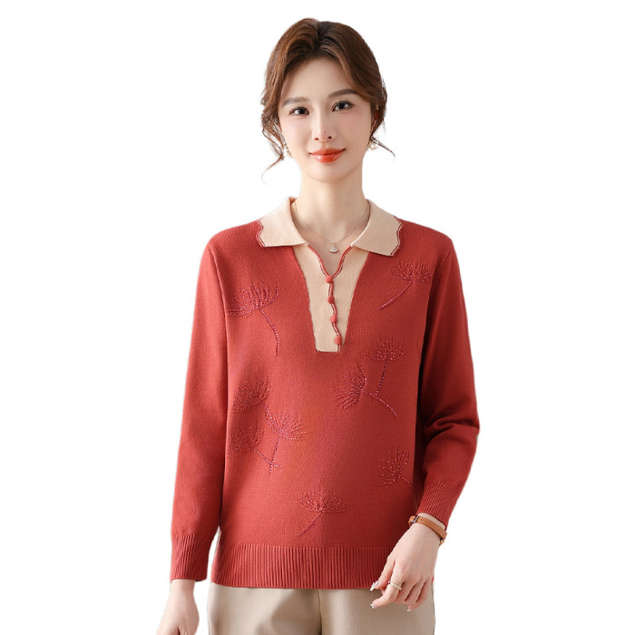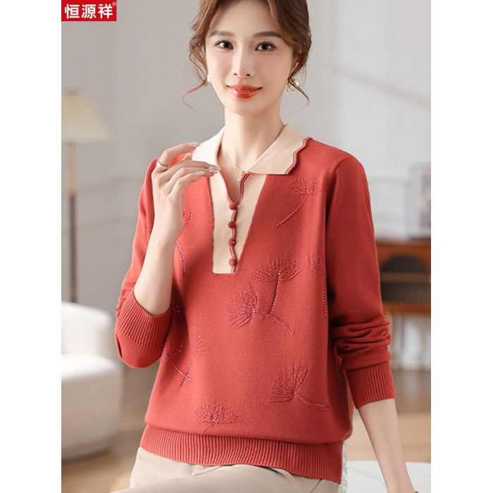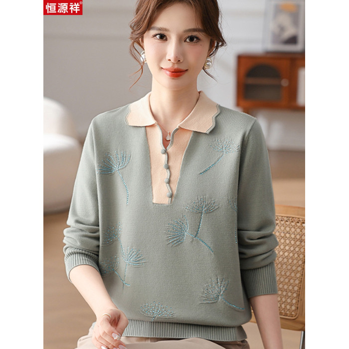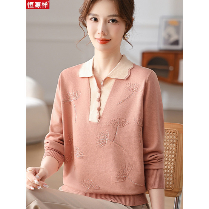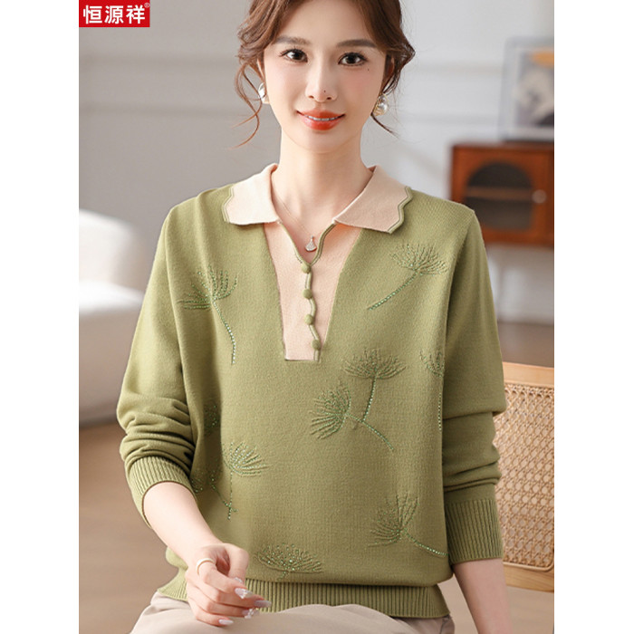 恒源祥中老年春秋羊毛針織衫小衫加大碼媽媽裝時尚翻領薄款打底衫