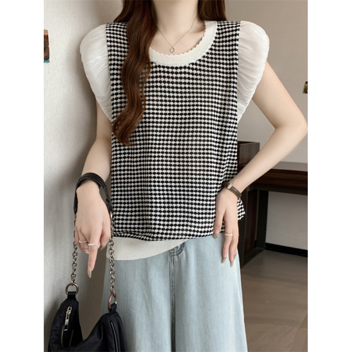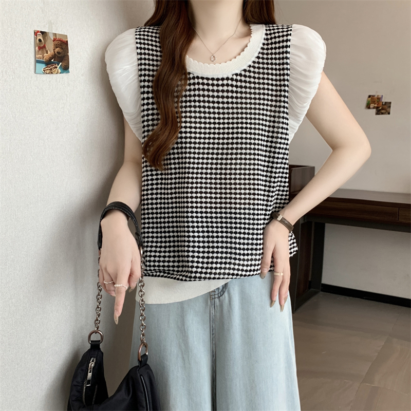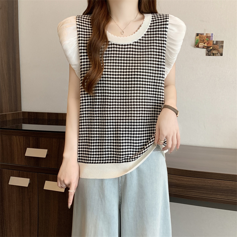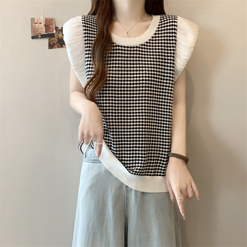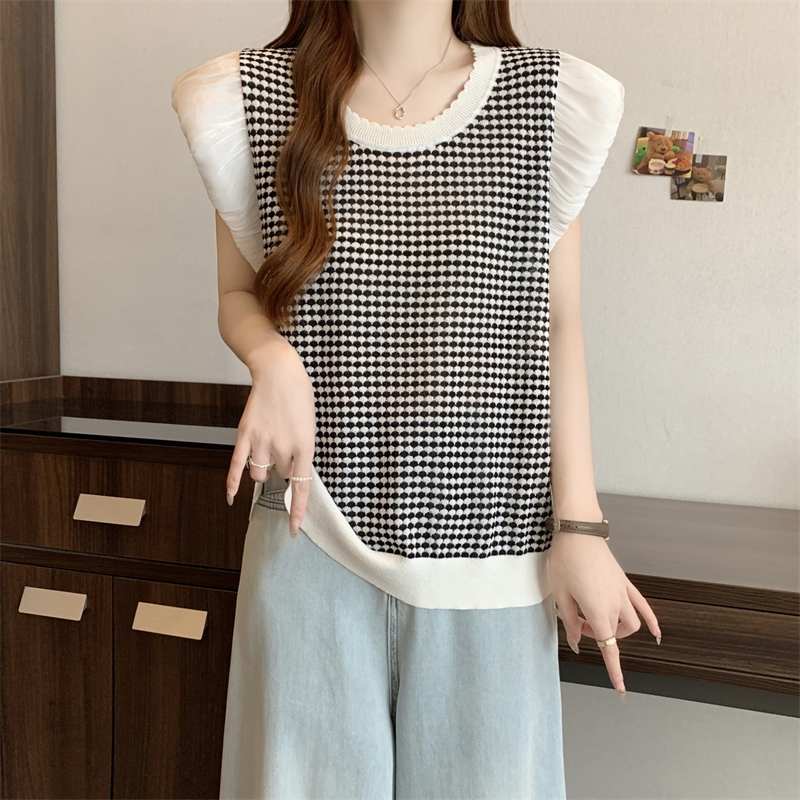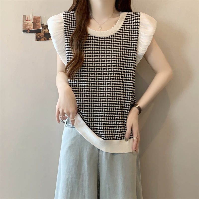 胖mm遮肚顯瘦網紗拼接格子無袖背心上衣女夏季氣質減齡百搭打底衫