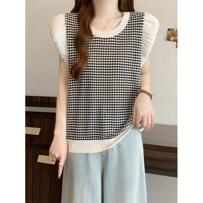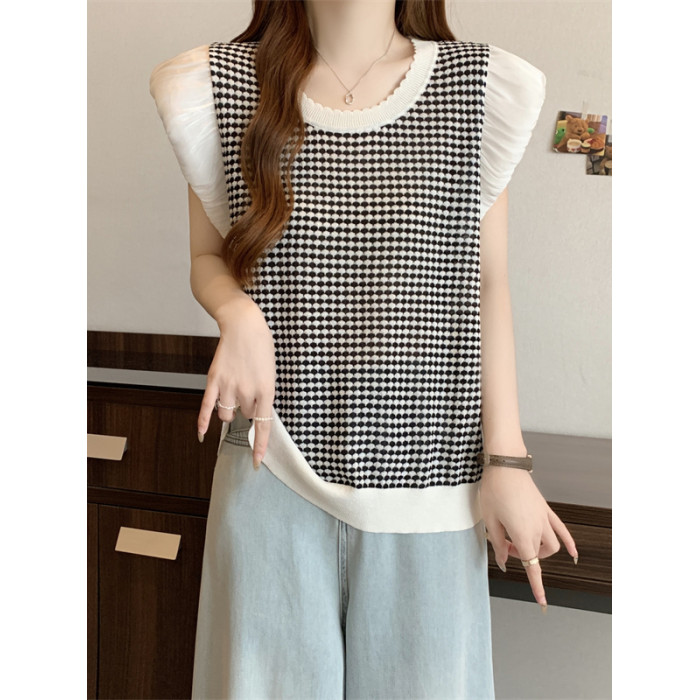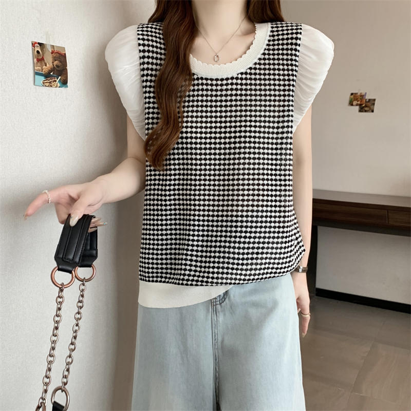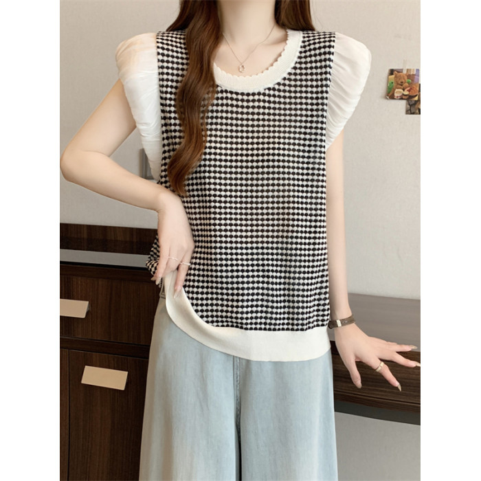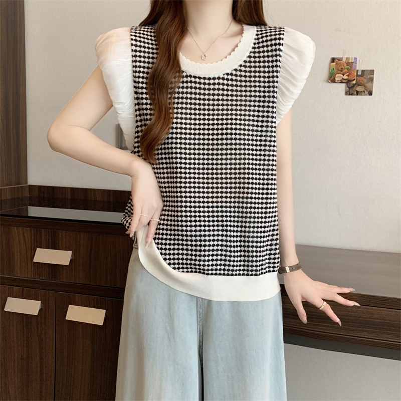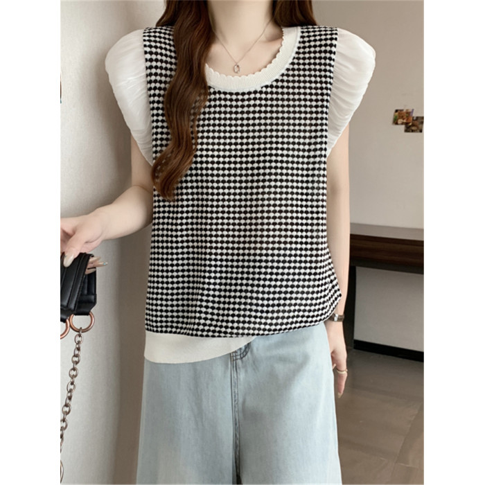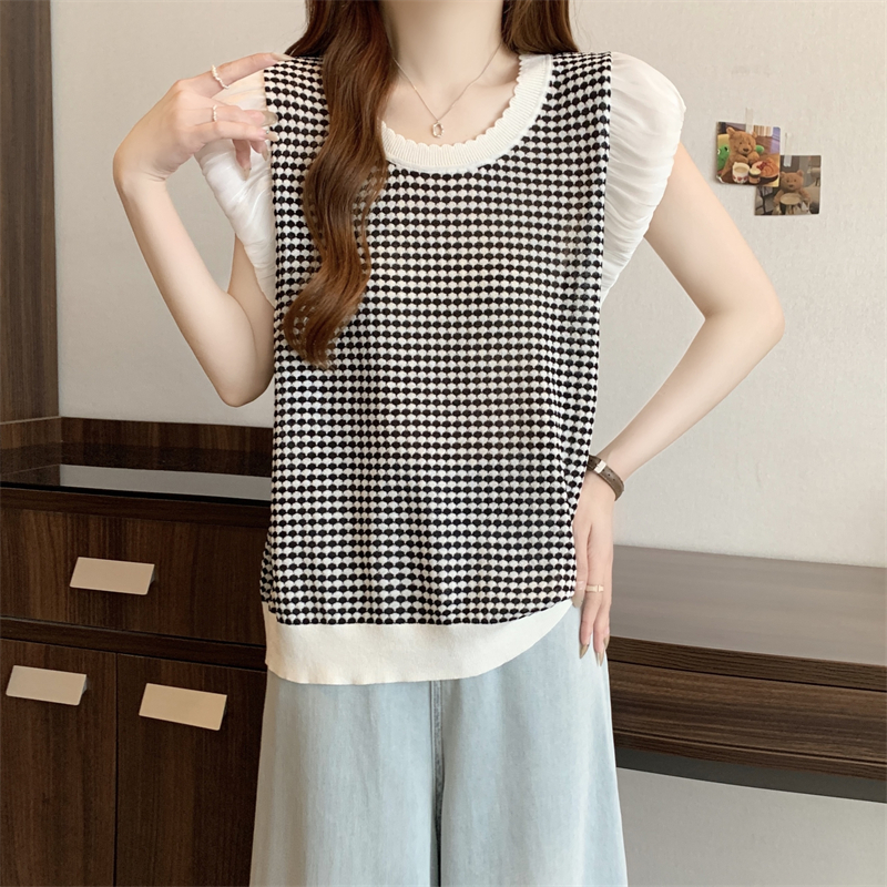 胖mm遮肚顯瘦網紗拼接格子無袖背心上衣女夏季氣質減齡百搭打底衫