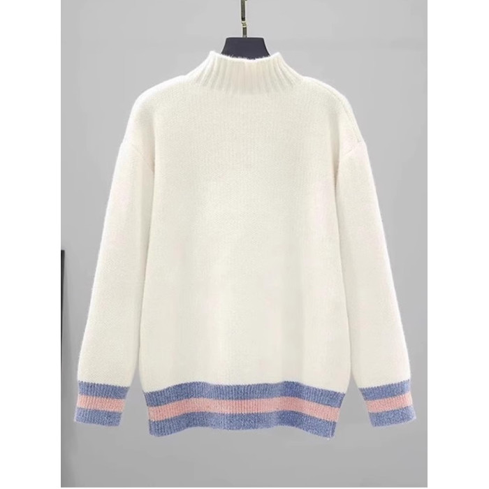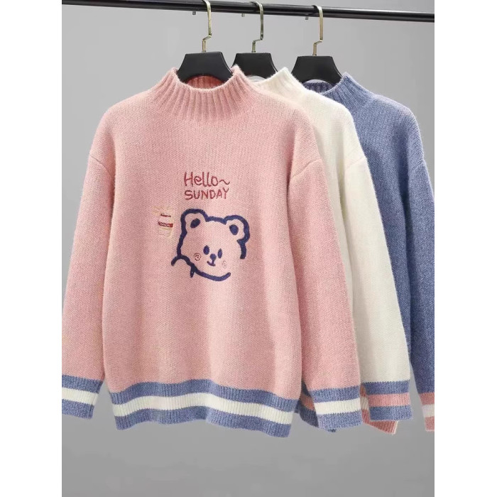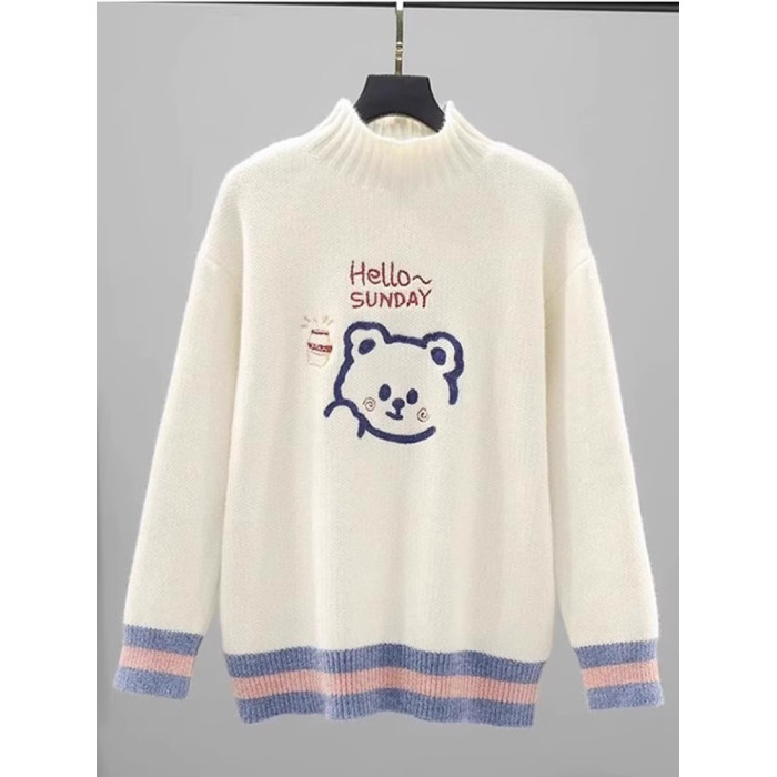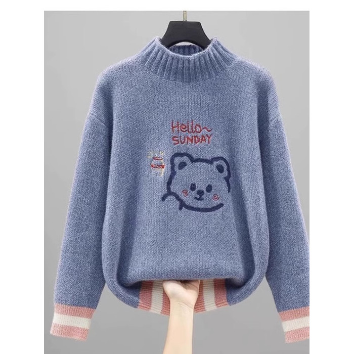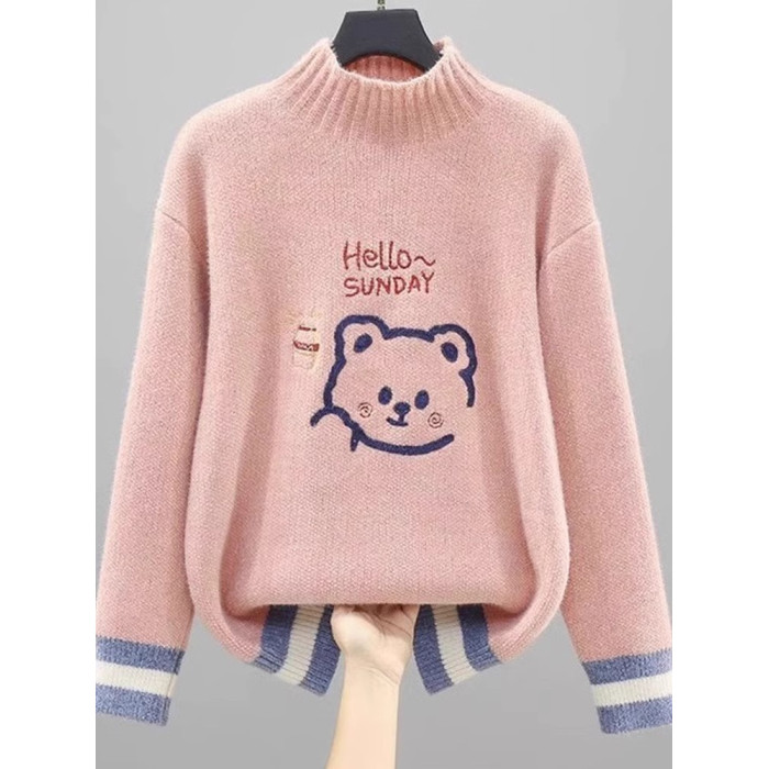 卡通套頭毛衣女秋冬季大童加絨加厚初中高中學生半高領針織打底衫
