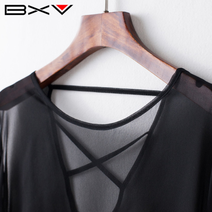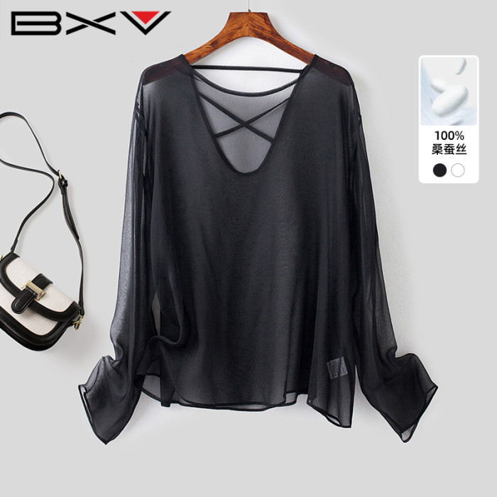 BXV黑色防曬衣真絲罩衫女2025夏新款套頭露背防曬服桑蠶絲上衣潮