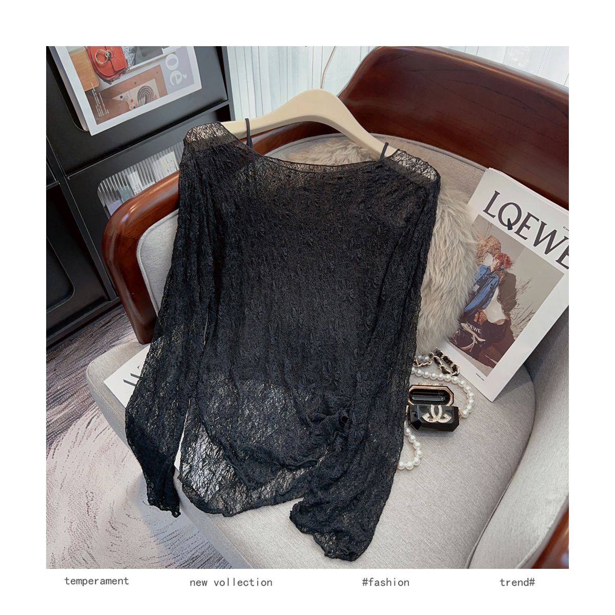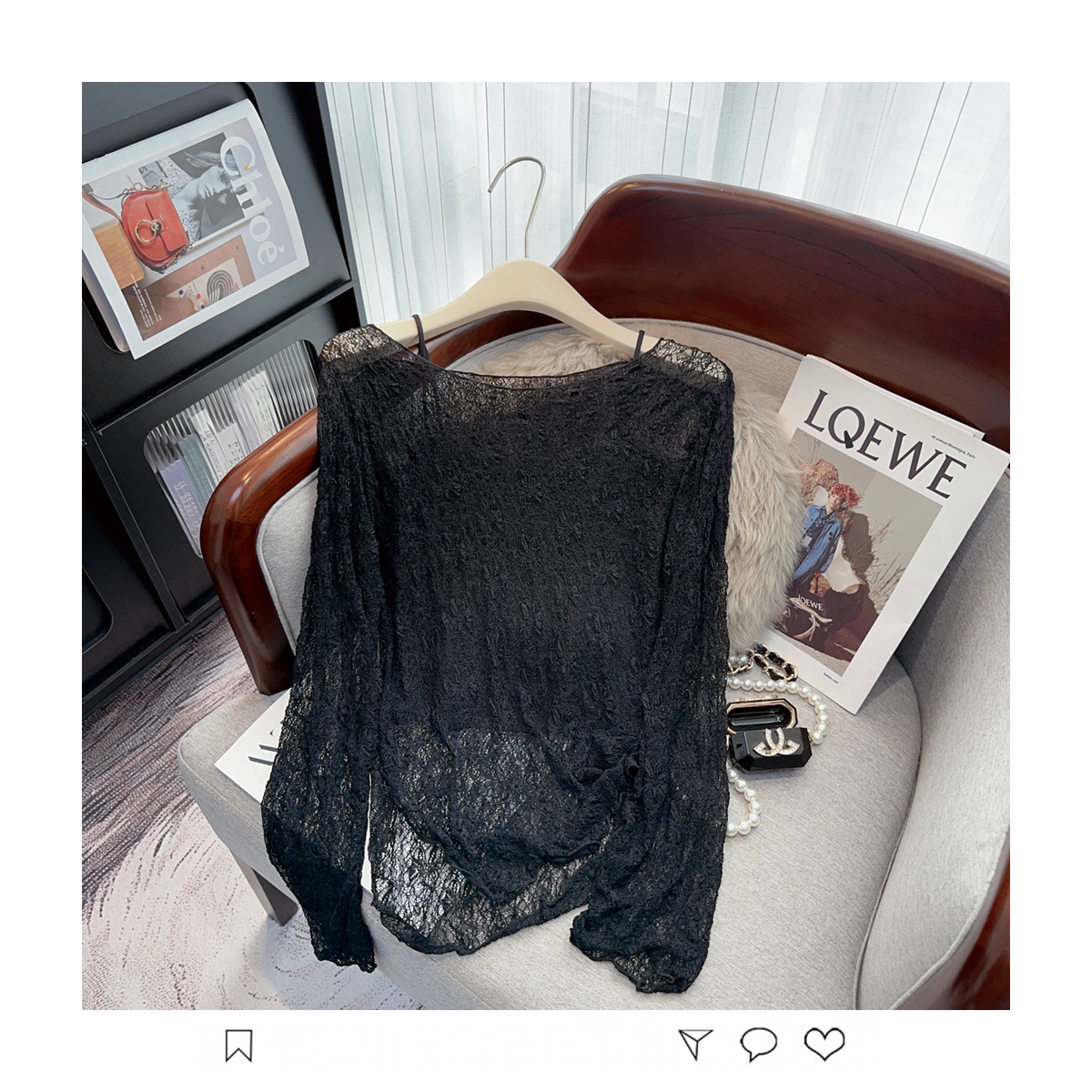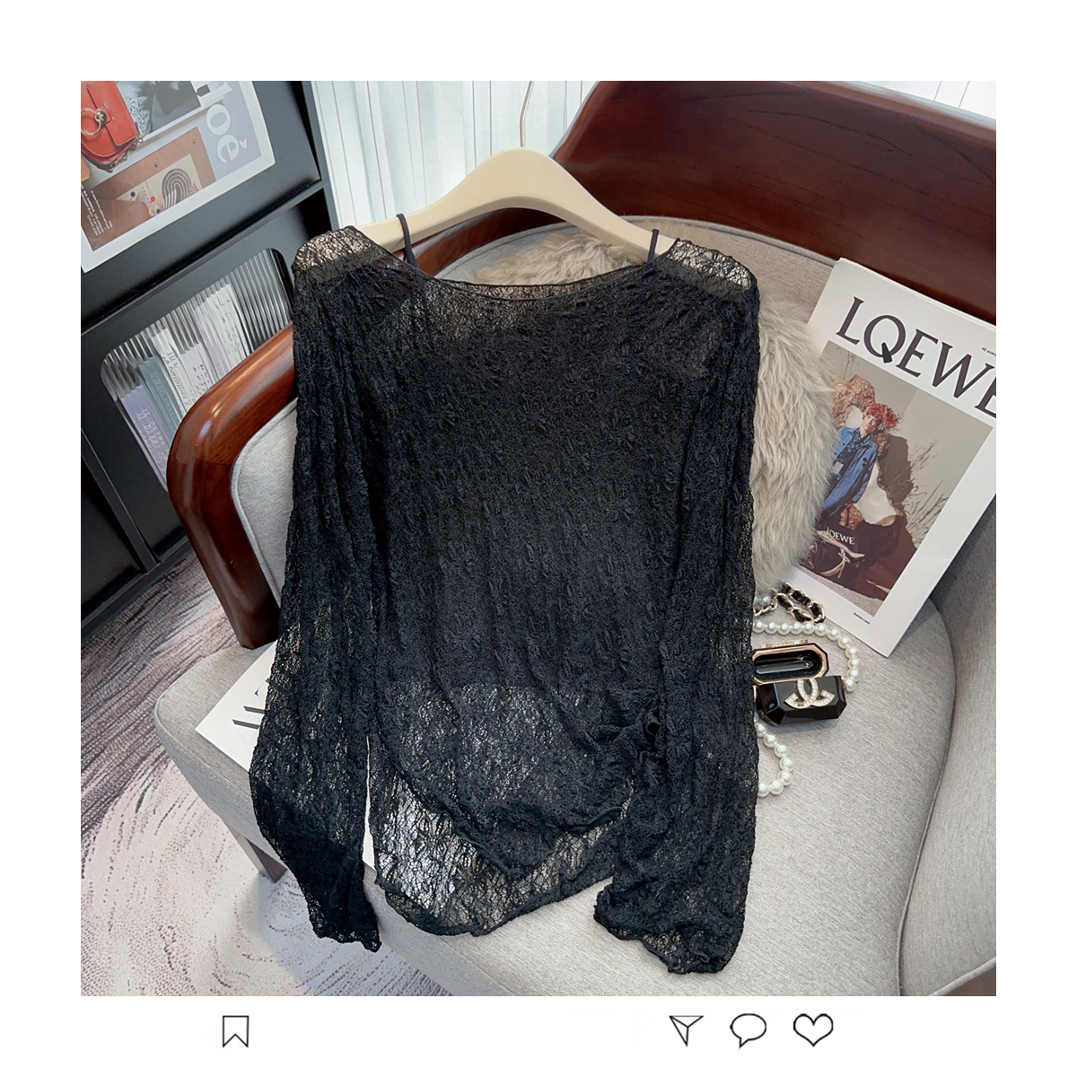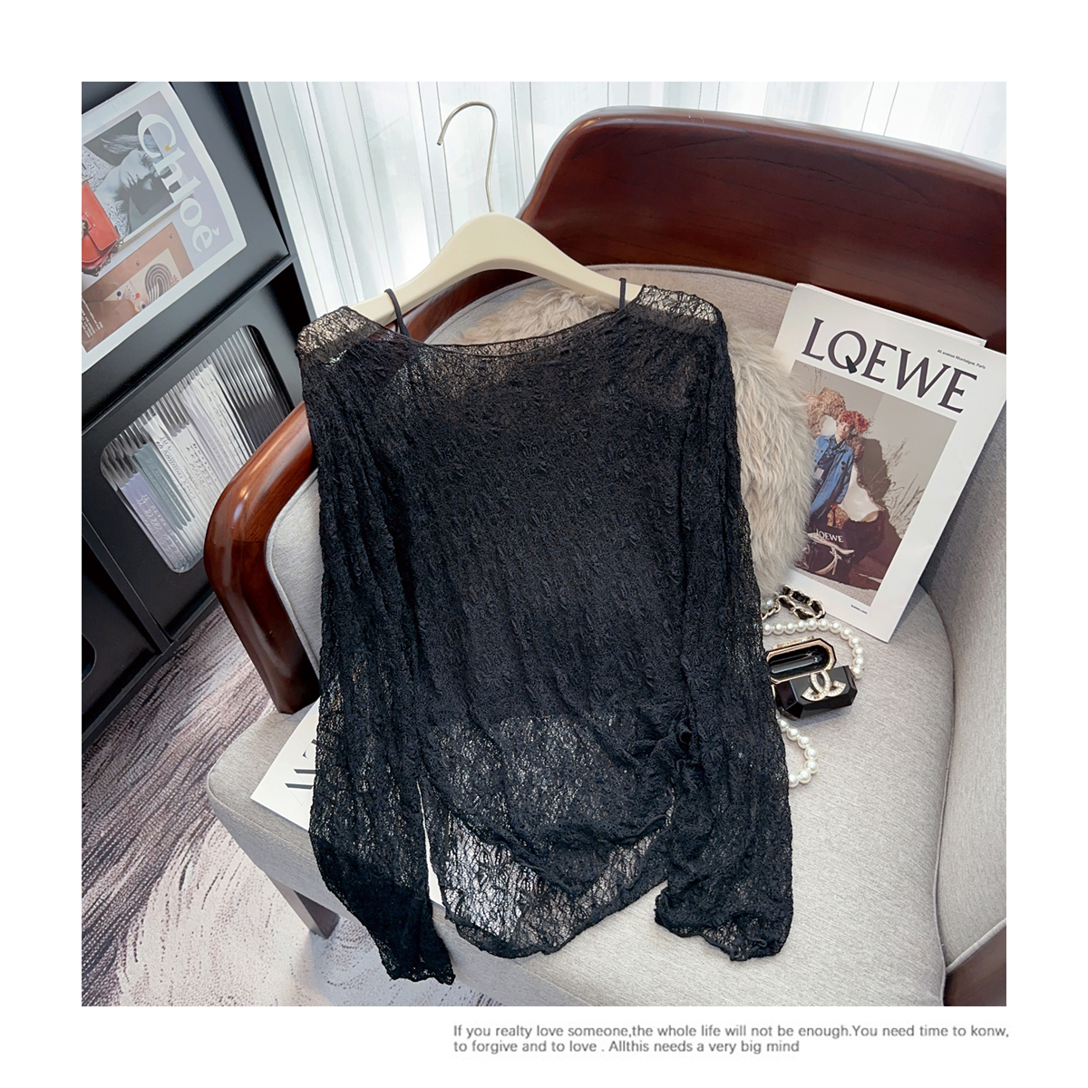 長袖圓領性感微透蕾絲衫女2025新款時髦ins性感修身內搭打底衫潮