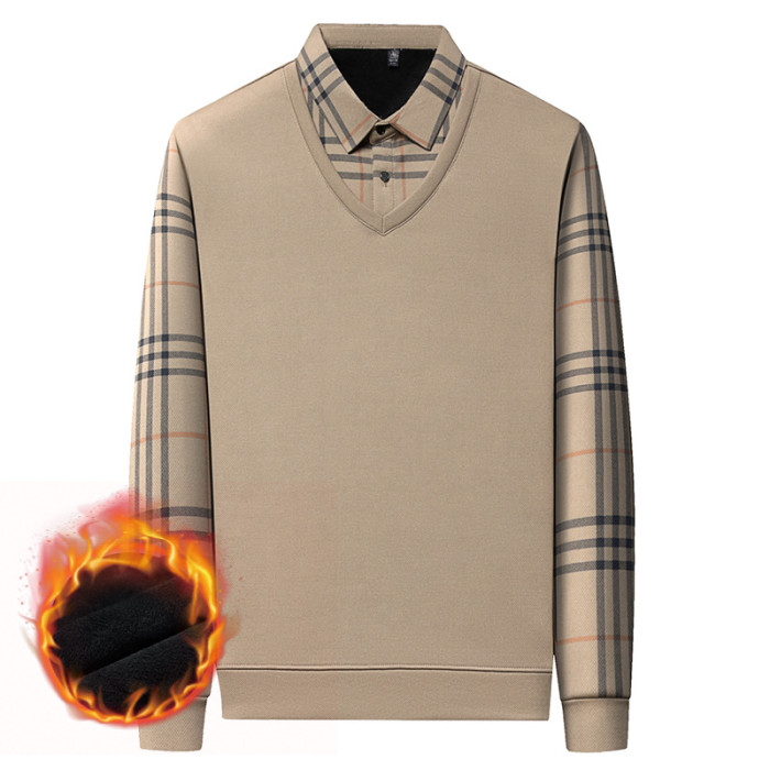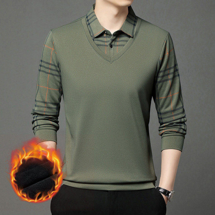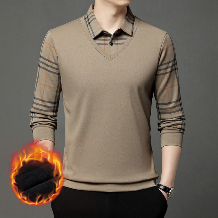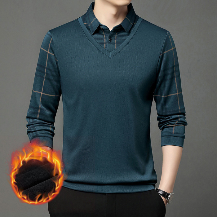 冬季新款加絨男士t恤針織衫休閒翻領假兩件中年男裝長袖T恤爸爸裝