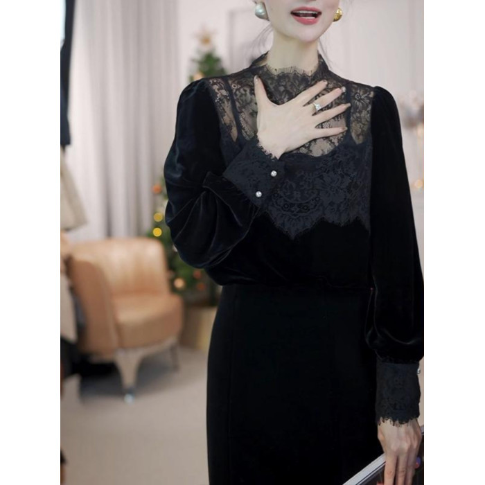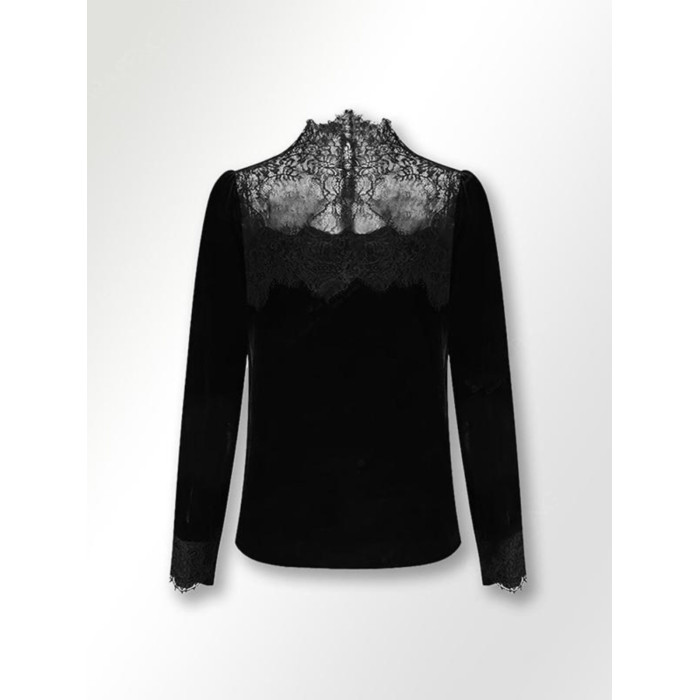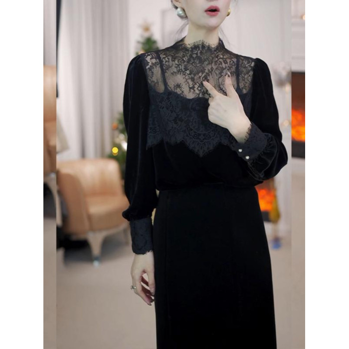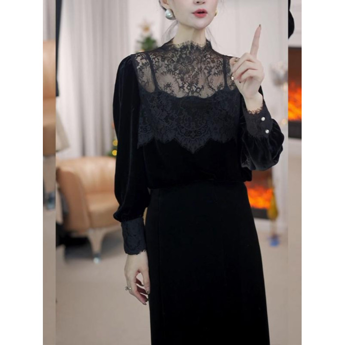 2025年秋季法式鏤空設計黑色絲絨上衣大碼女裝胖MM蕾絲拼接打底衫