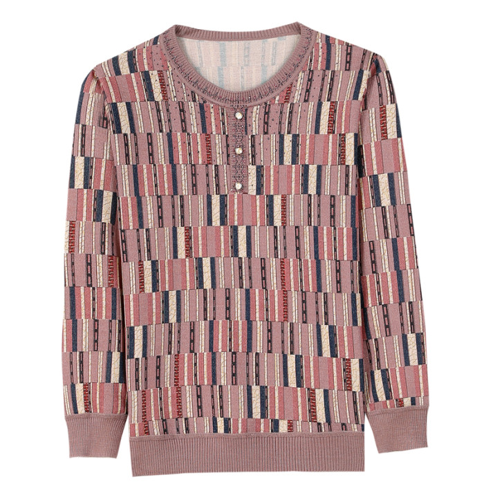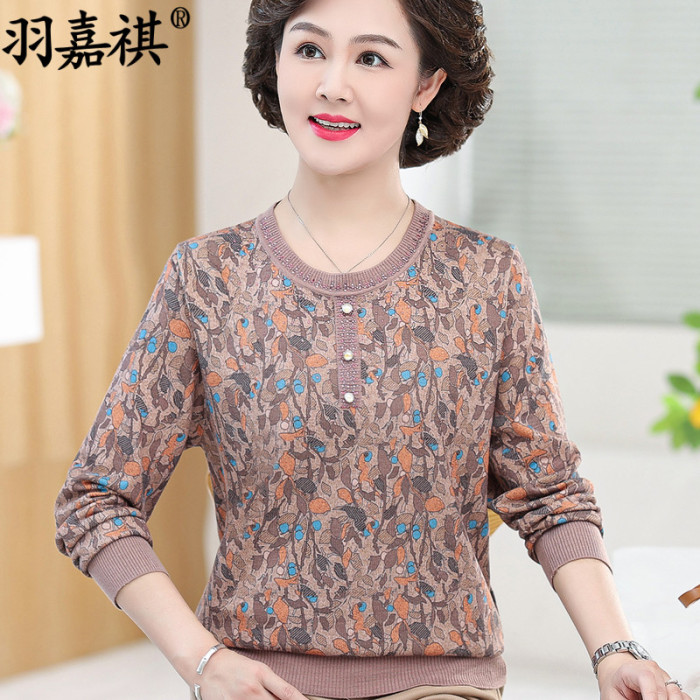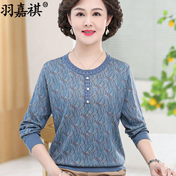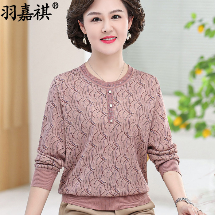 中老年女秋裝圓領打底衫洋氣50嵗媽媽裝春秋時尚長袖上衣薄款毛衣