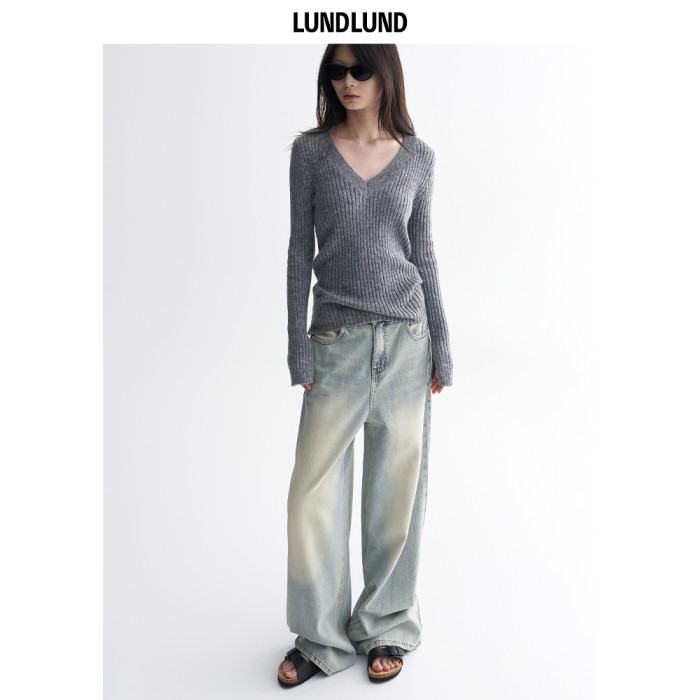 LUNDLUND 紙片人慵懶開衩袖針織打底衫女春夏百搭V領顯瘦長袖上衣
