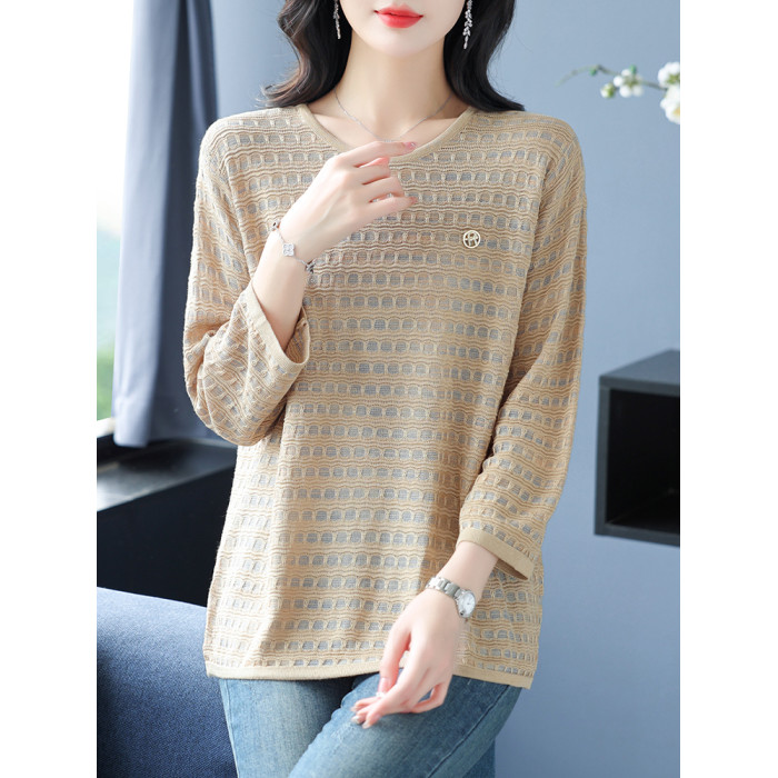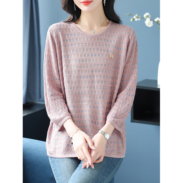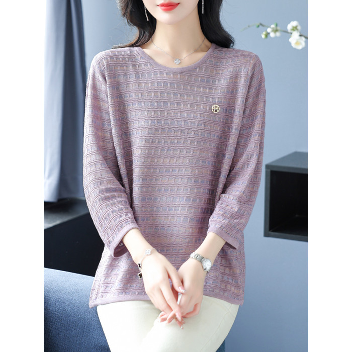 秋季媽媽裝桑蠶絲圓領針織上衣女新款七分袖加肥特大碼休閒打底衫