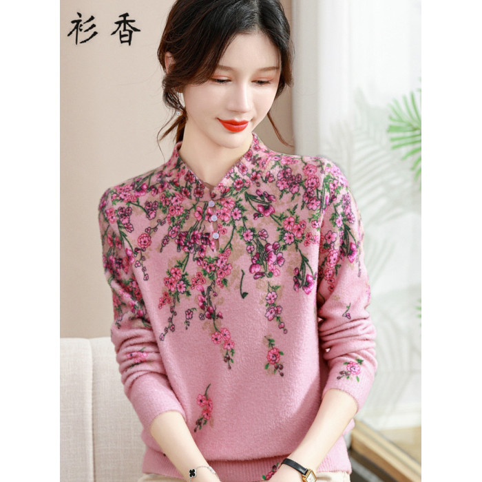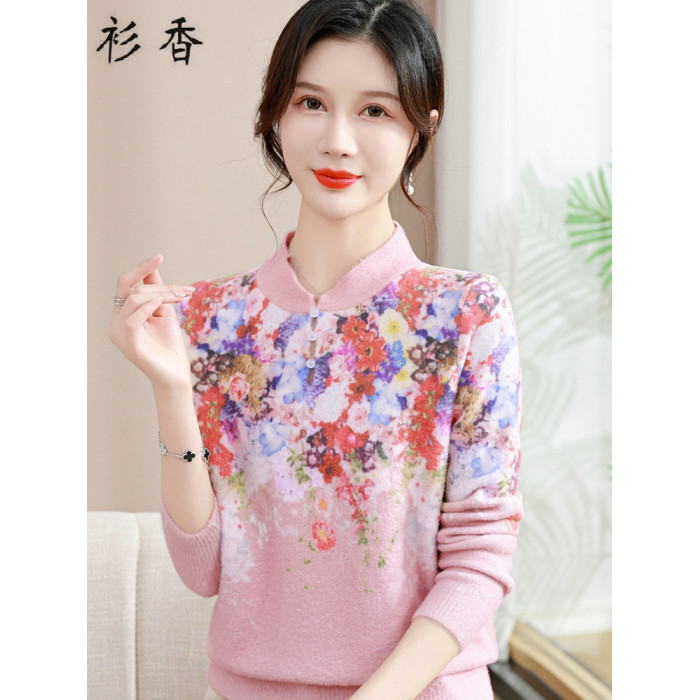 媽媽秋冬裝新款水貂絨加厚毛衣中年女式旗袍領上衣保暖內搭打底衫