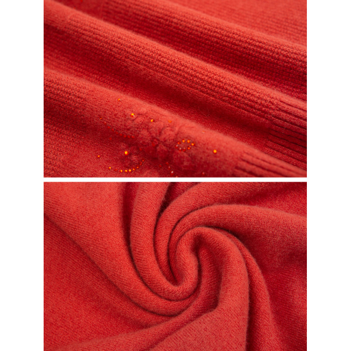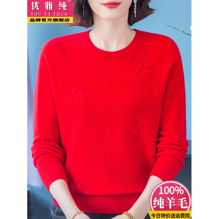 100純羊毛衫女秋冬新款毛衣打底衫圓領寬松玫紅上衣高級感媽媽裝