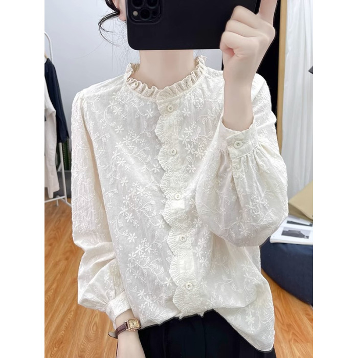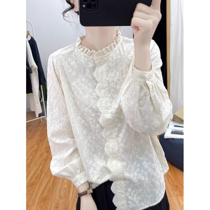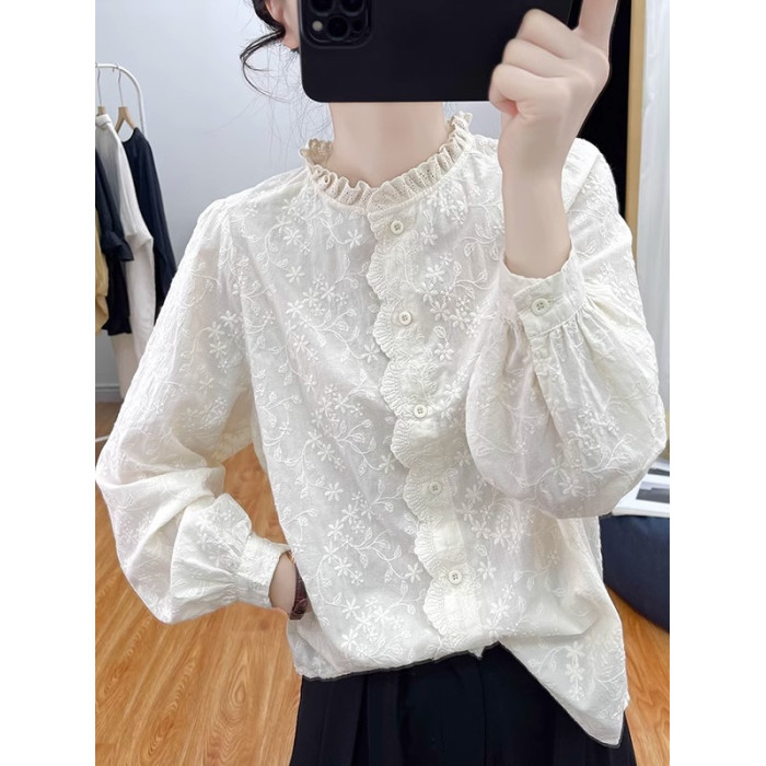 ~女裝純棉木耳領蕾絲刺長袖襯衫女打底衫春新款襯衣上衣