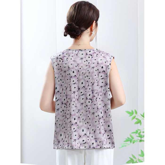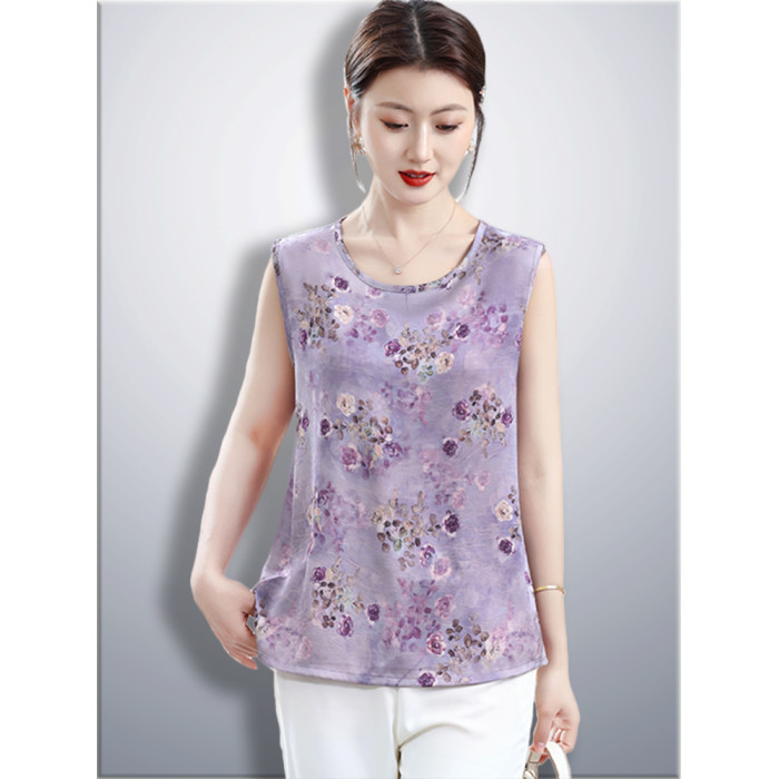 香雲紗仿真絲新款夏季圓領背心打底衫中年女寬松坎肩薄款無袖上衣