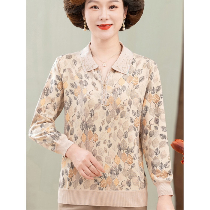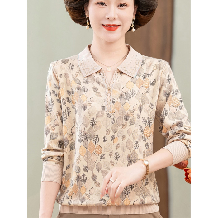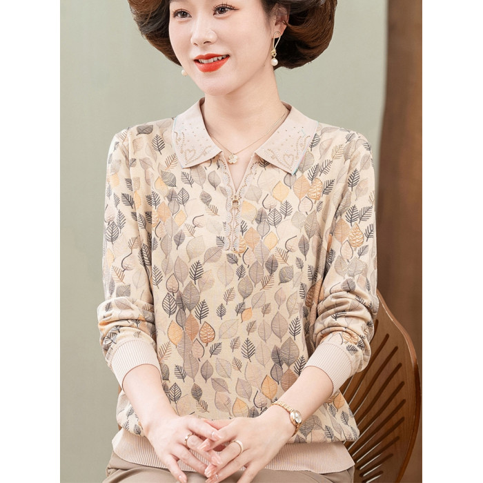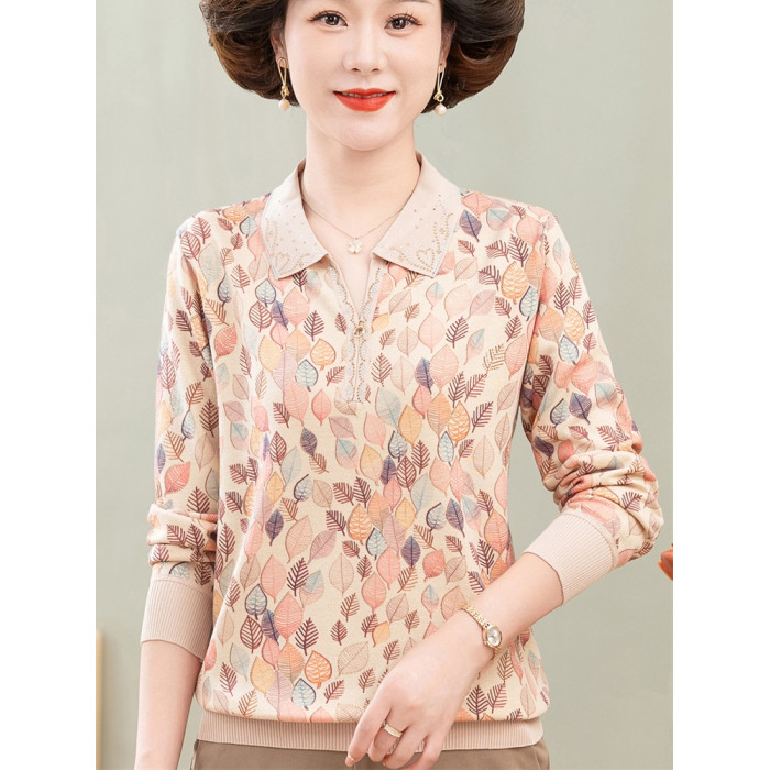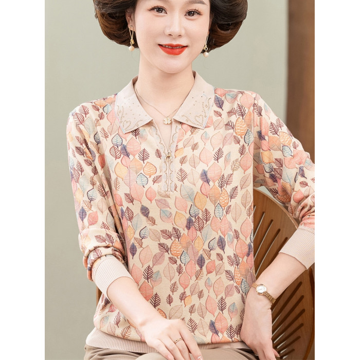 2024媽媽新款薄款針織打底衫時尚中老年人秋裝翻領休閒印花薄小衫