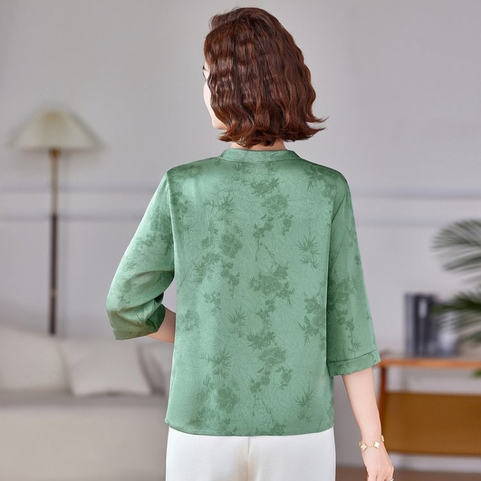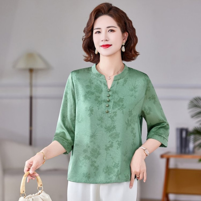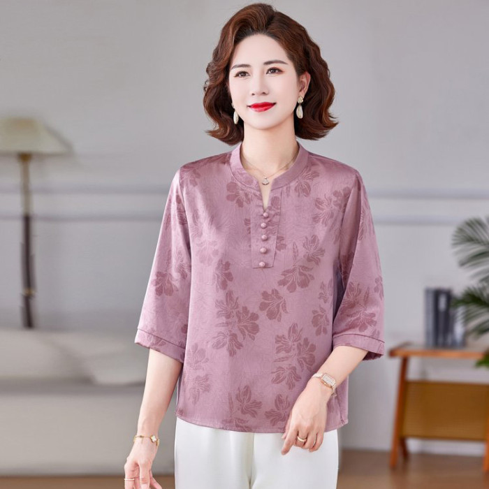 中老年媽媽裝夏季新款洋氣時尚氣質顯瘦寬松打底衫小衫上衣女V領