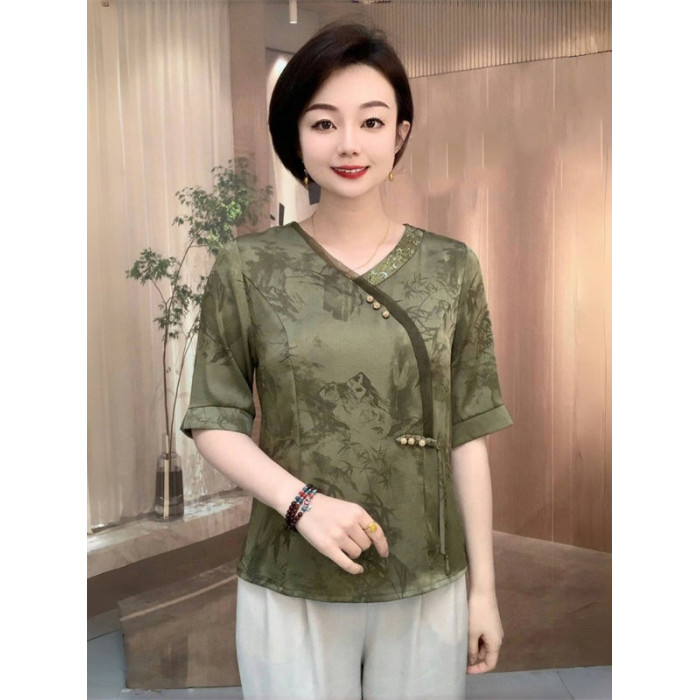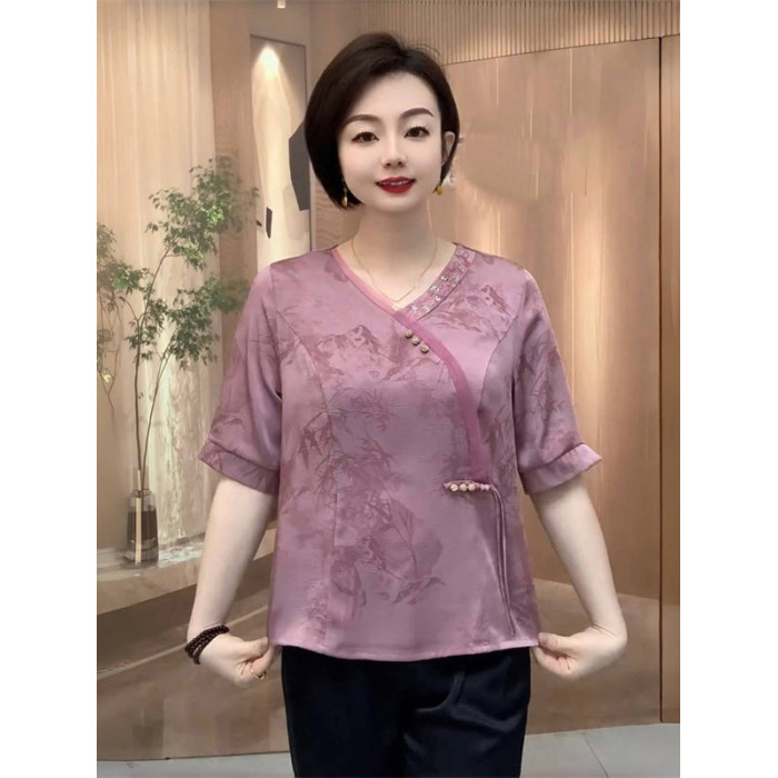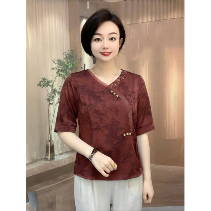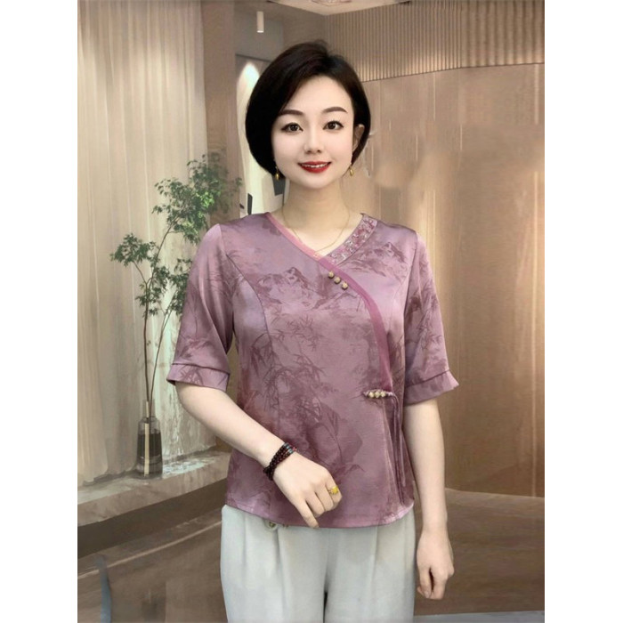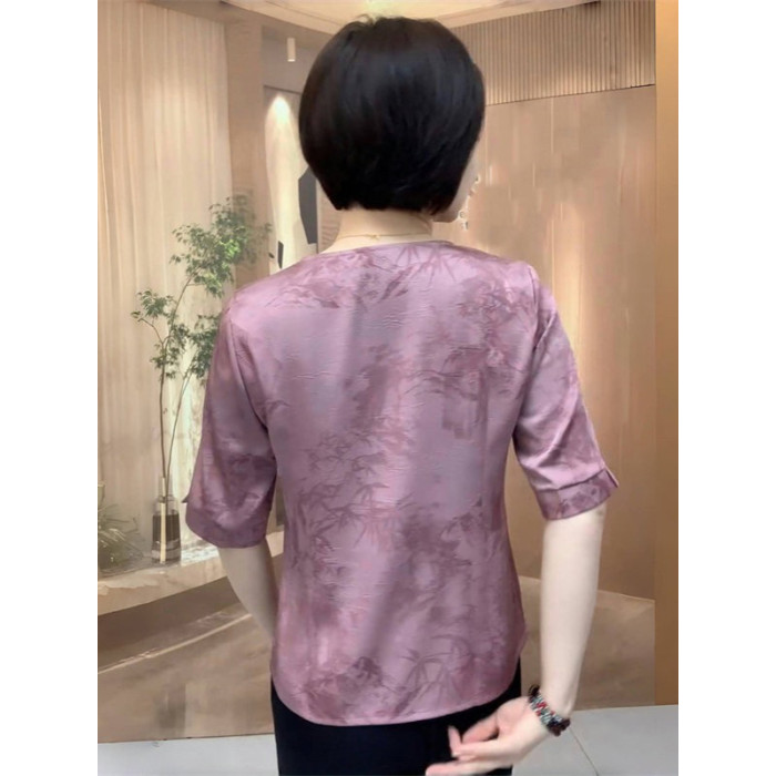 新中式國風旗袍上衣夏季新款洋氣媽媽短袖真絲提花緞打底衫襯衫女