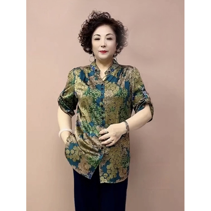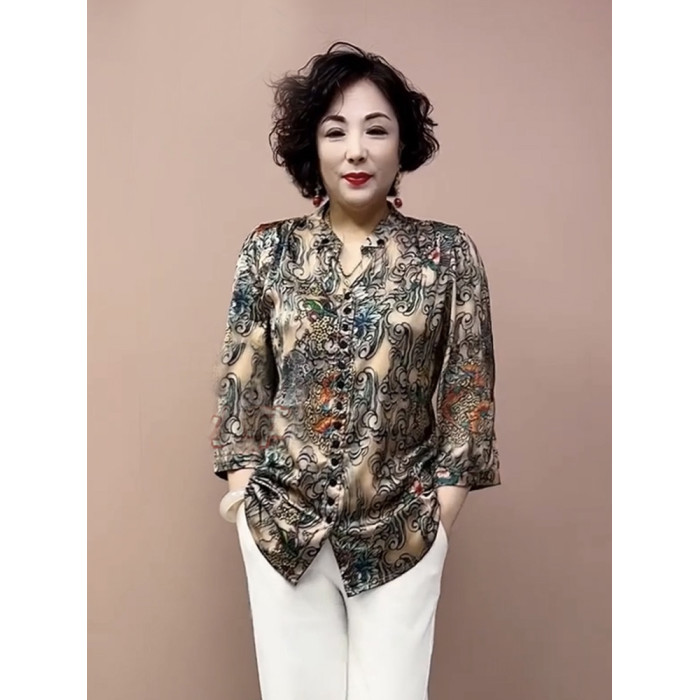 中老年媽媽真絲上衣夏季新款中袖大碼遮肚顯瘦桑蠶絲花色打底衫女