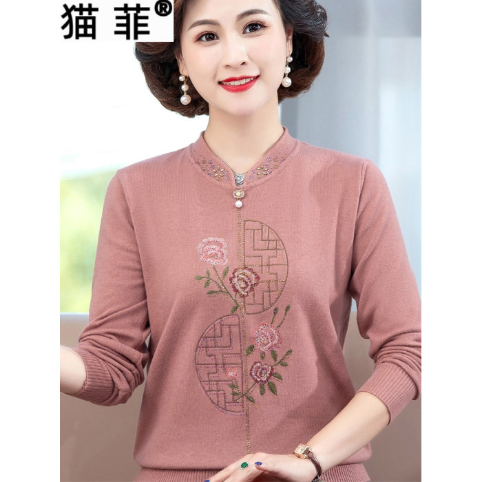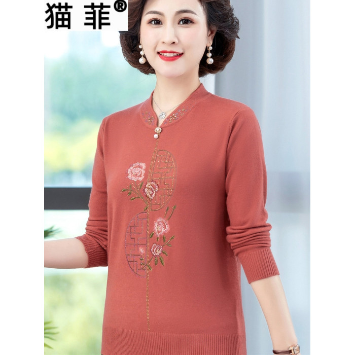 春秋中年媽媽洋氣毛衣旗袍領上衣中老年女裝長袖針織小衫打底衫