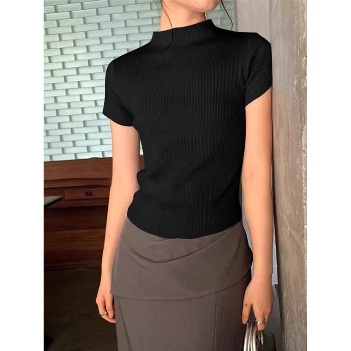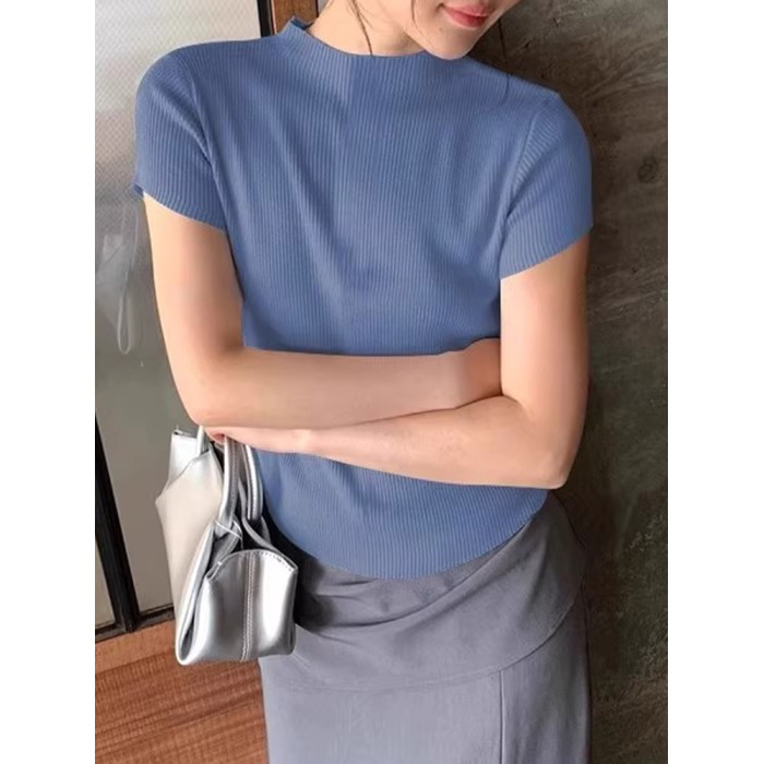 ROUJE KEFSS法式半高領薄款短袖針織衫女夏季修身打底衫正肩上衣
