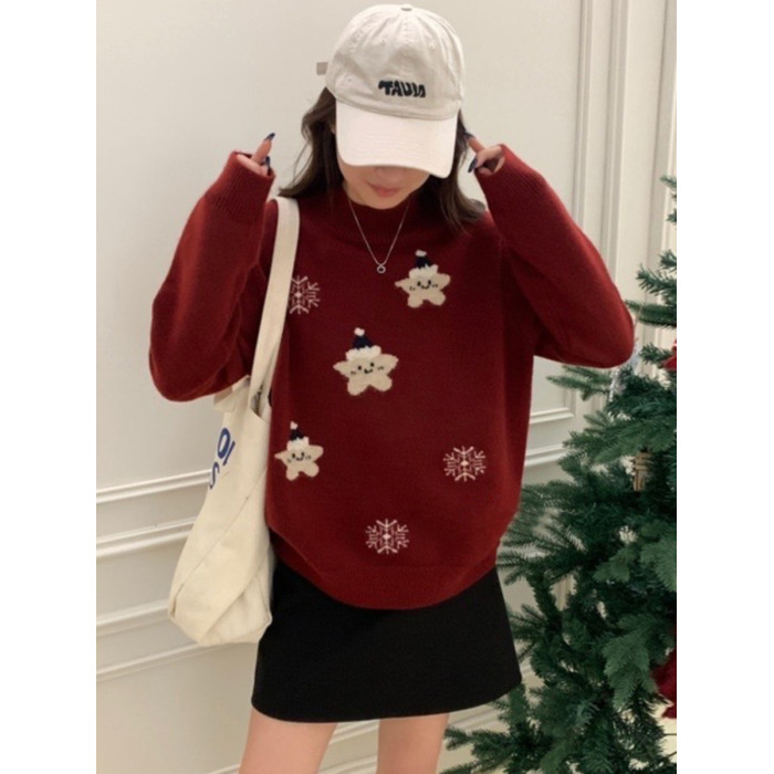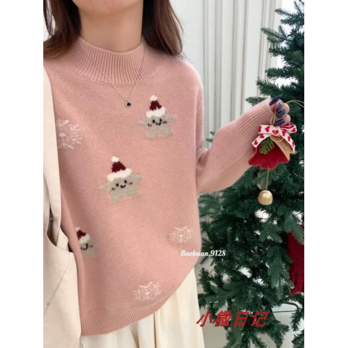 初中學生卡通小貓半高領毛衣少女甜美韓系針織內搭上衣大童打底衫