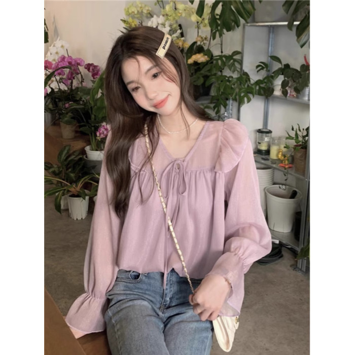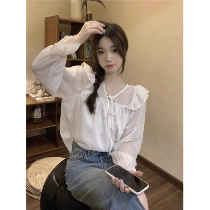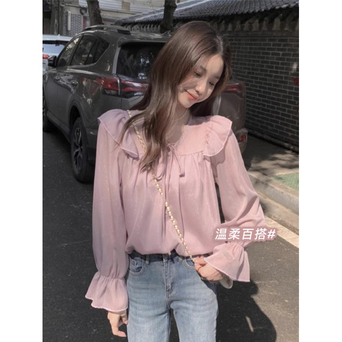 韓系溫柔荷葉邊系帶襯衫女早春夏法式別致甜美設計小衆雪紡衫上衣