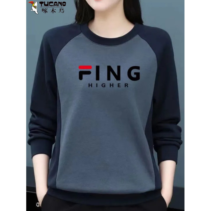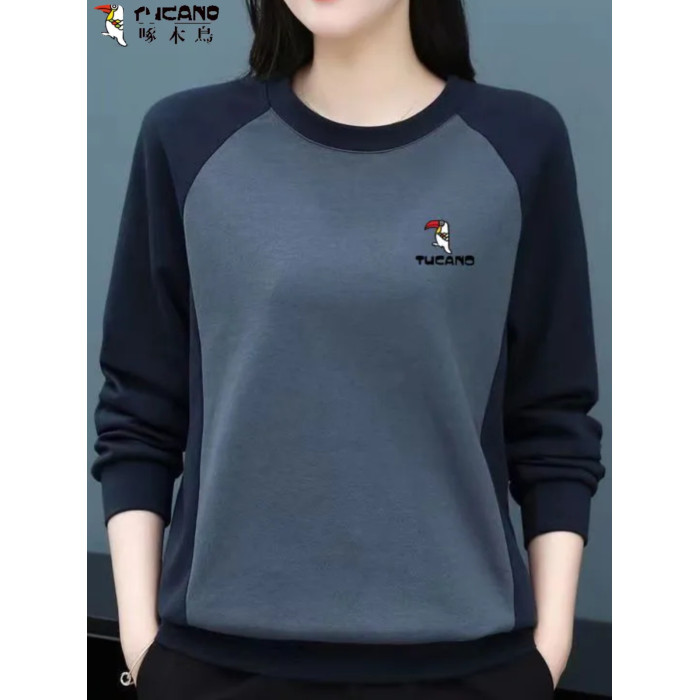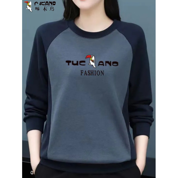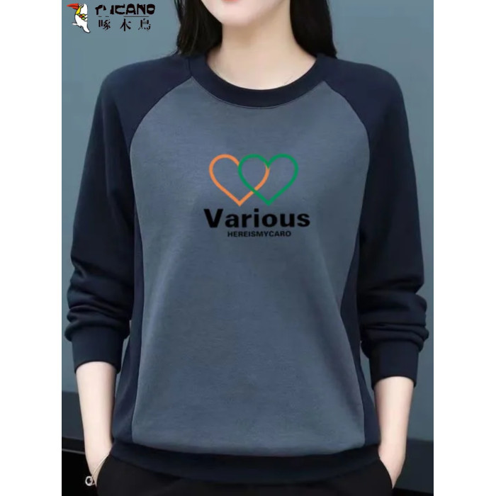 啄木鳥純棉圓領印花衛衣女2025春秋新款時尚寬松長袖遮肉打底衫女