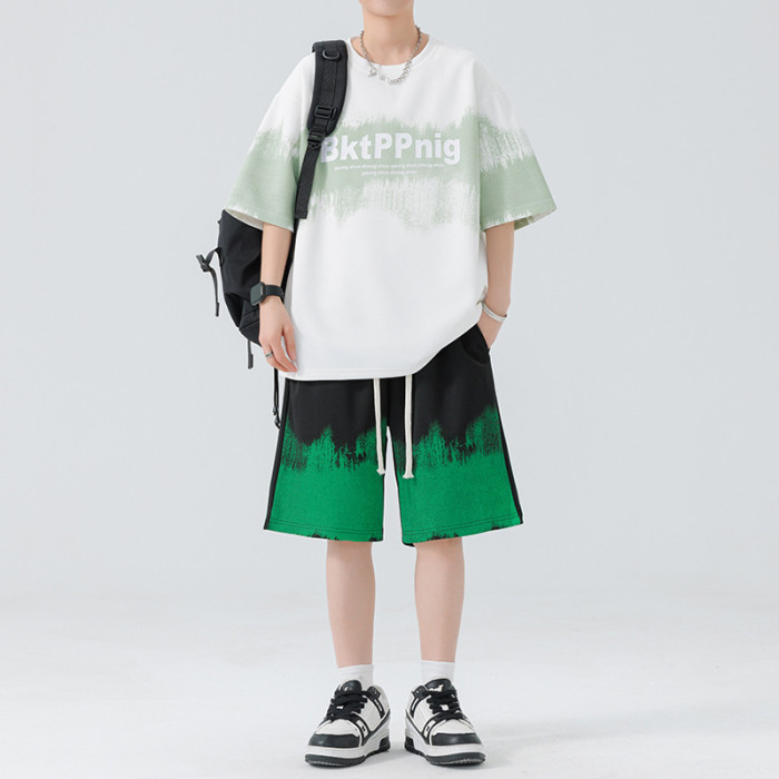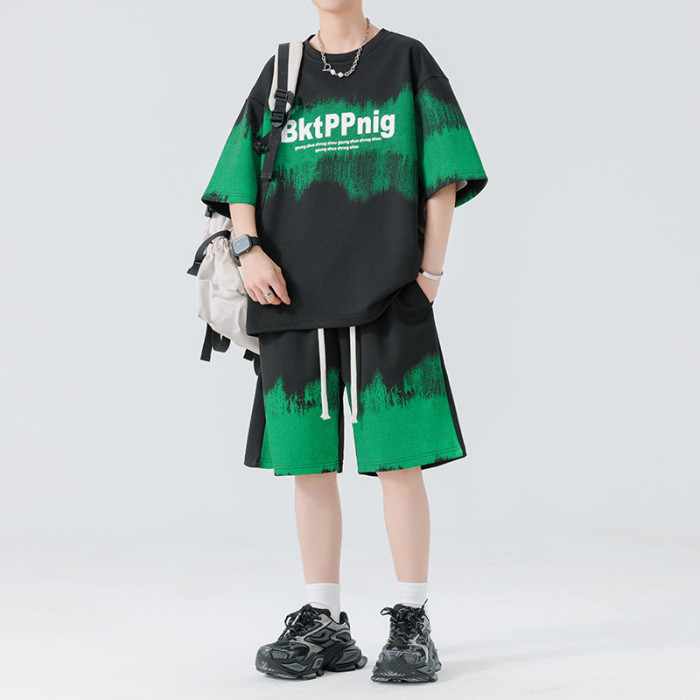 2025休閒運動套裝男夏季潮牌紥染冰絲t恤男青少年短袖短褲搭配一