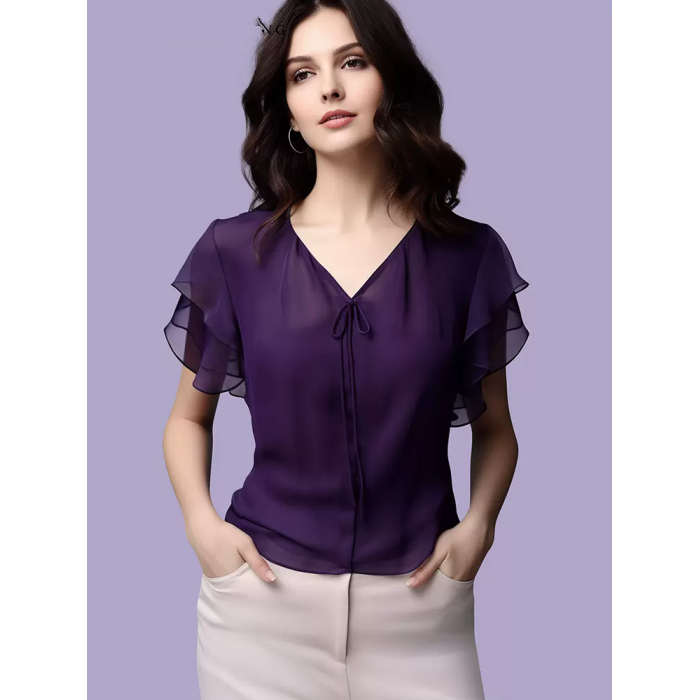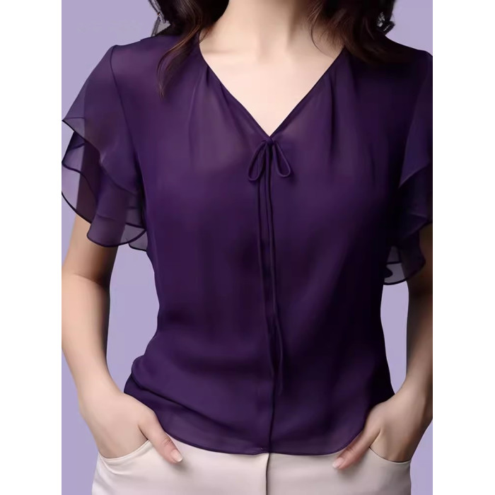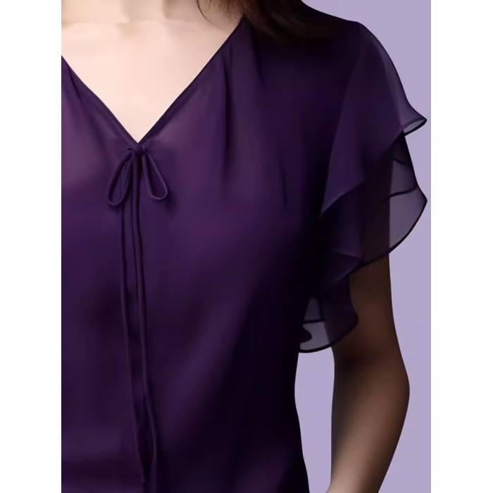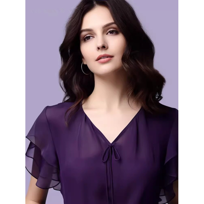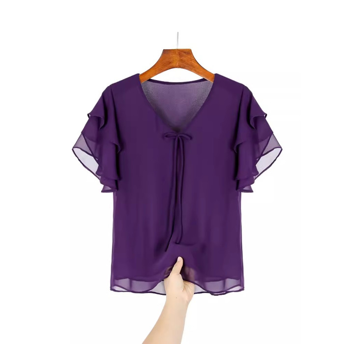 歐洲站2024夏季紫色荷葉邊雪紡衫上衣女V領收腰洋氣打底衫襯衣