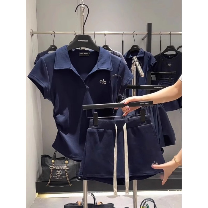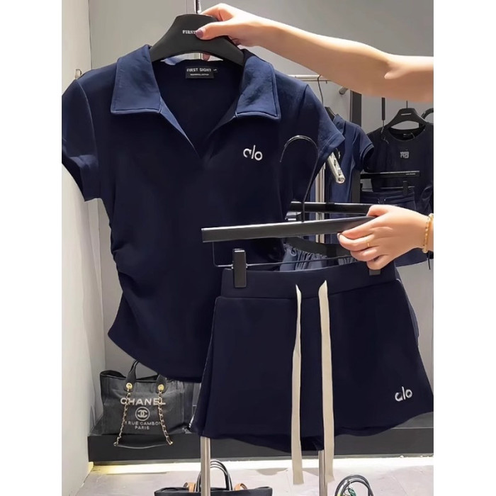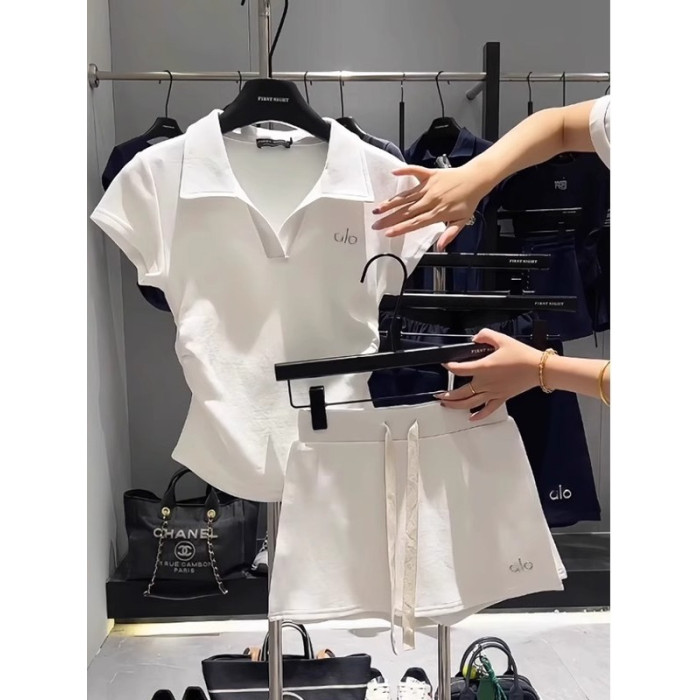 LILY MOST2025休閒運動套裝女polo衫收腰白色短袖T恤松緊腰兩件套
