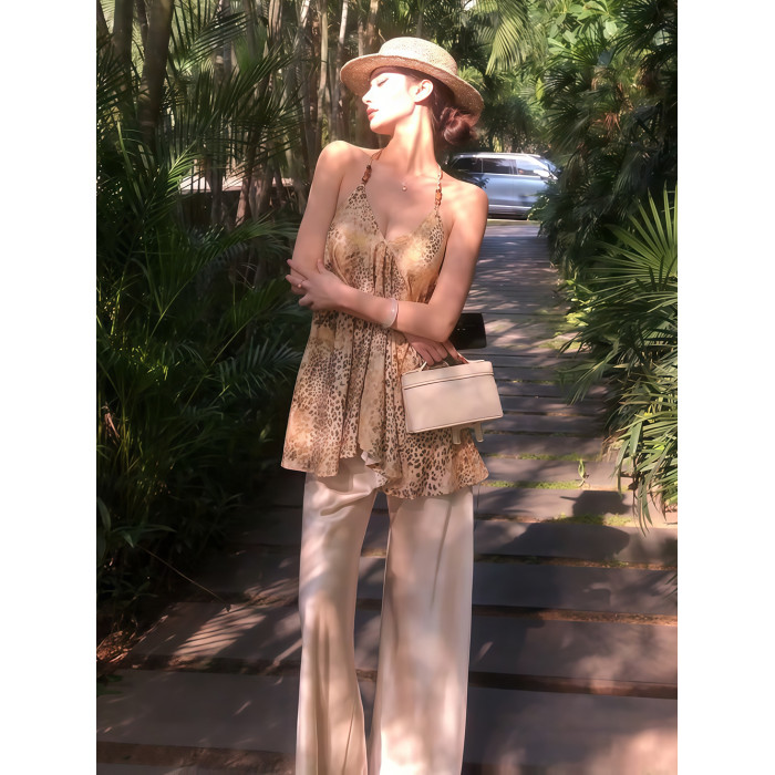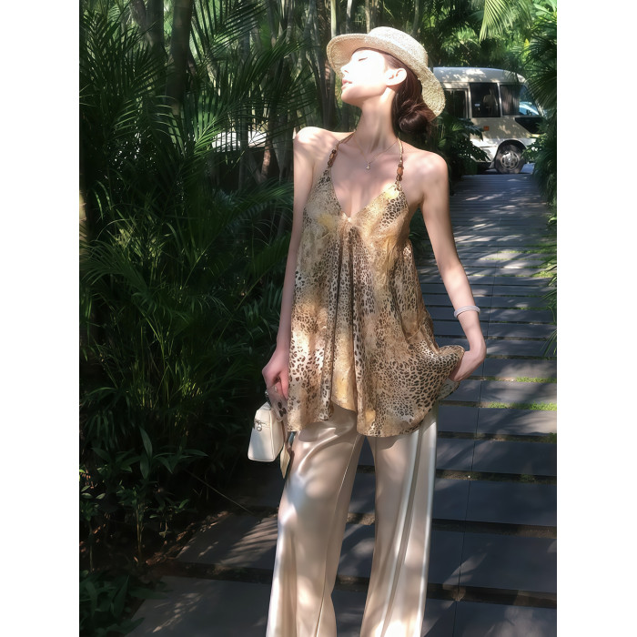 不規則豹紋串珠吊帶衫連衣裙女2025夏季天絲醋酸V領上衣辣妹短裙