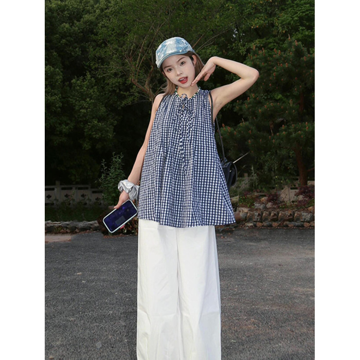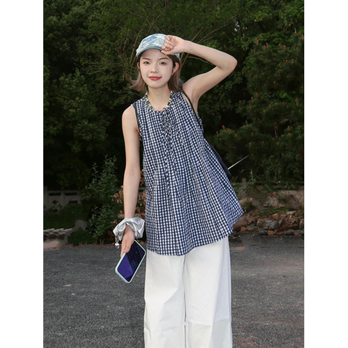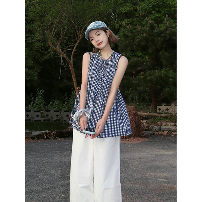 復古藍白格子無袖襯衫女吊帶衫2025夏季新款寬松系帶娃娃背心上衣