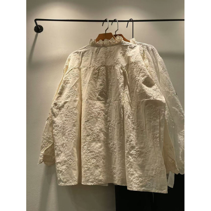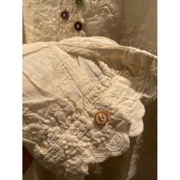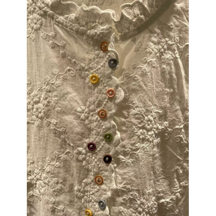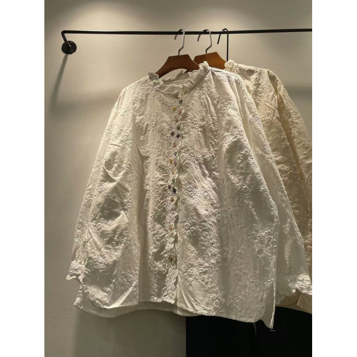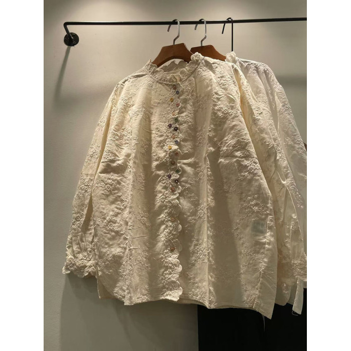 2025春季女裝新款花邊領刺綉彩色釦子純棉寬松長袖襯衫女襯衣上衣
