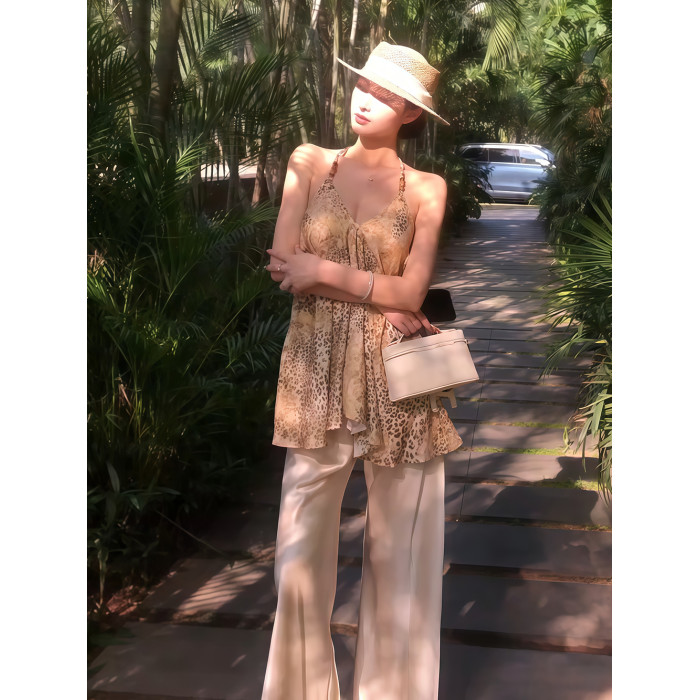 不規則豹紋串珠吊帶衫女2025夏天季新款天絲醋酸V領上衣辣妹