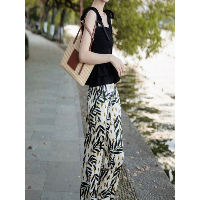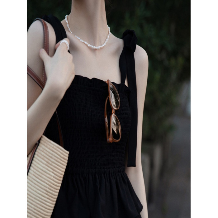 小背心女設計感荷葉邊修身顯瘦系帶上衣外穿赫本風黑色短款吊帶衫