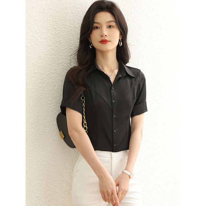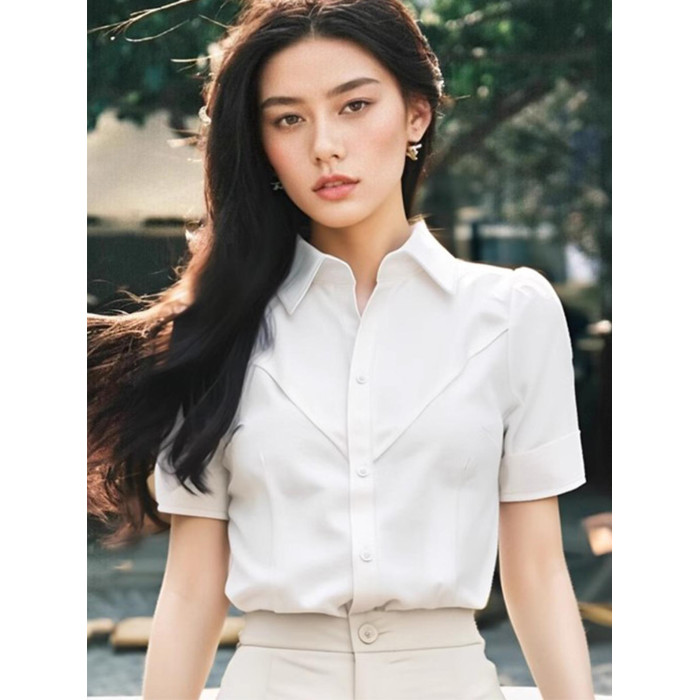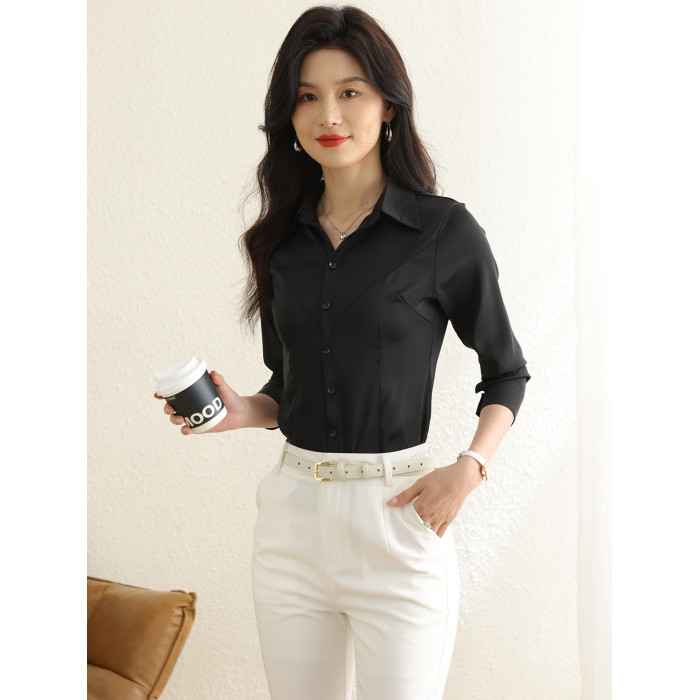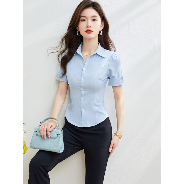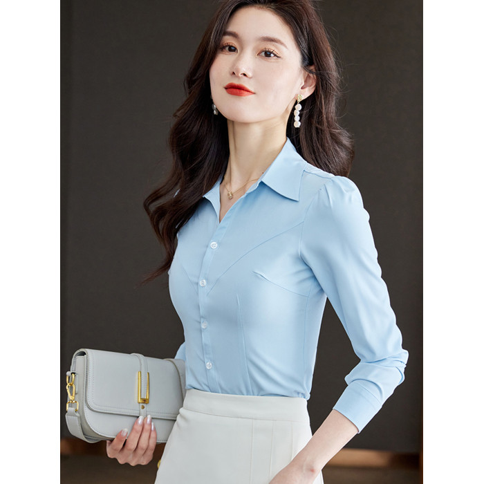 高級彈力免燙修身襯衫小衆純色長袖短款v領收腰防走光合體女襯衣