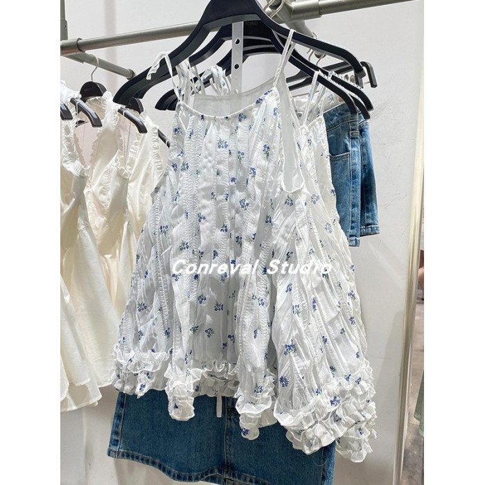 SH&UR2025夏季新款甜美休閒田園風撞色碎花圖案吊帶衫超仙上衣女