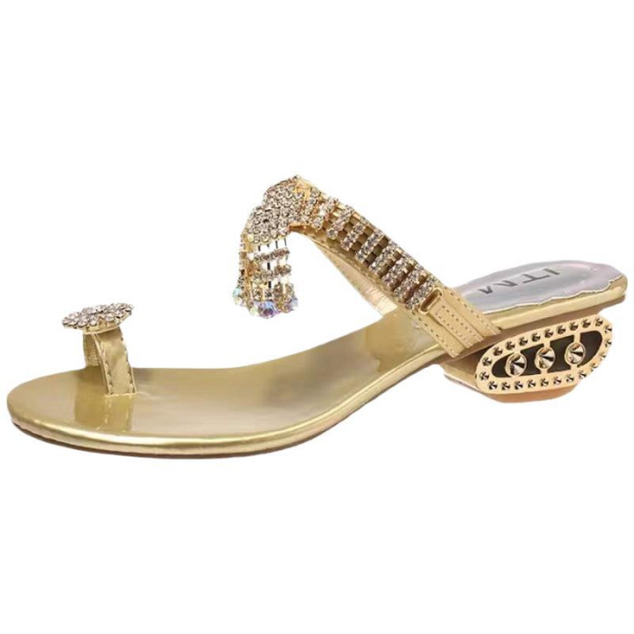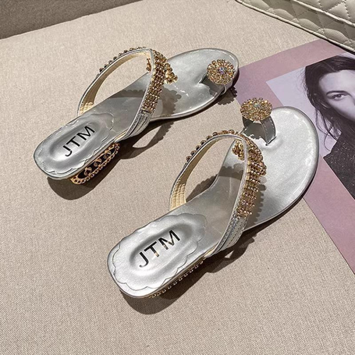 網紅設計感小衆氣質粗跟水鑽拖鞋女2025夏季新款外穿夾趾沙灘涼拖