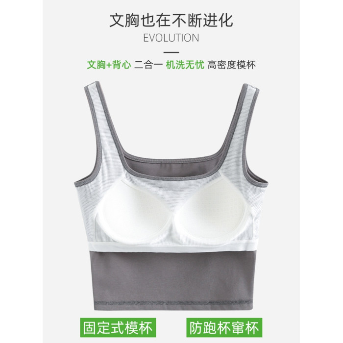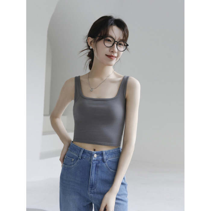 純棉帶胸墊方領背心女短款性感美背防走光露臍打底無袖吊帶衫上衣