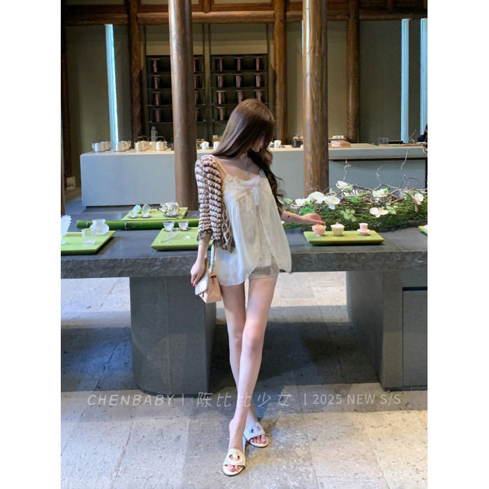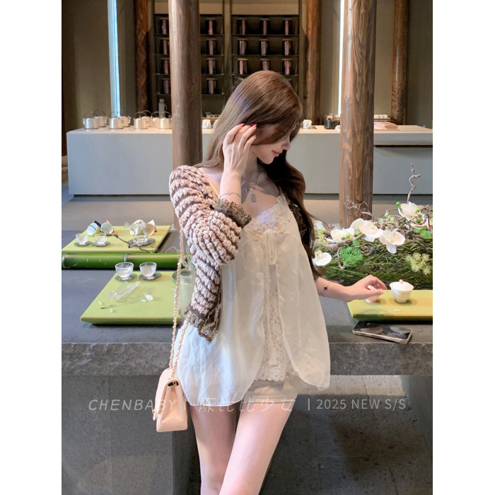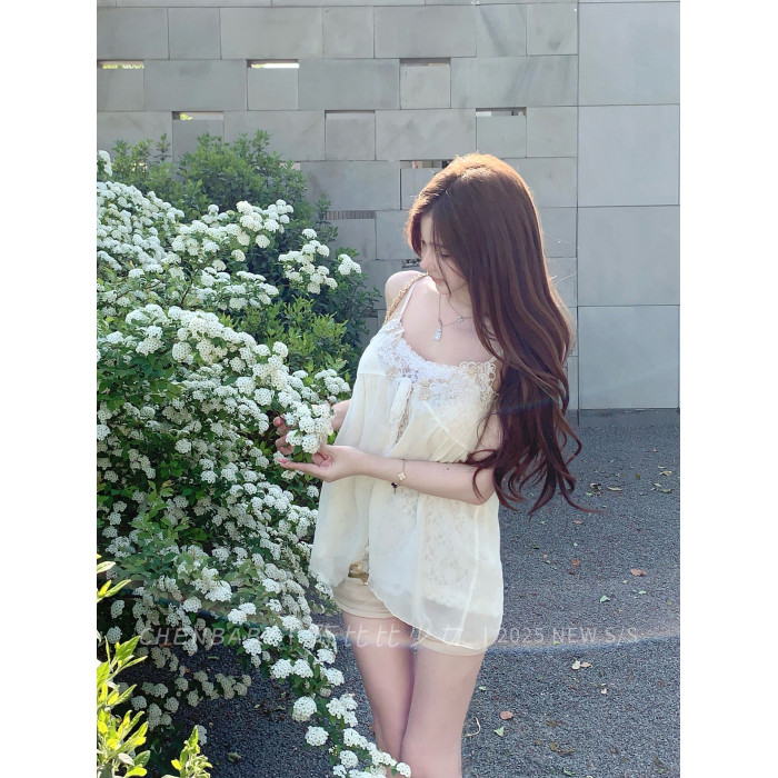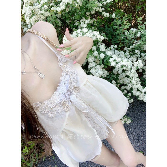 法式復古刺綉網紗吊帶衫女夏季新甜美風娃娃衫設計感小衆蕾絲上衣