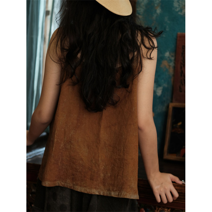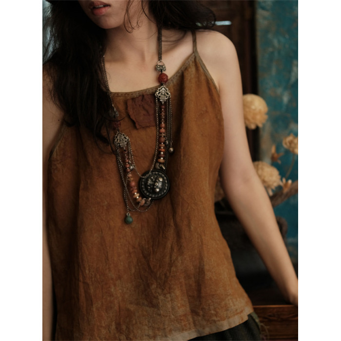 斑駁鐵綉染做舊麻料復古文藝吊帶衫幾見手工線跡貼布小背心基本款