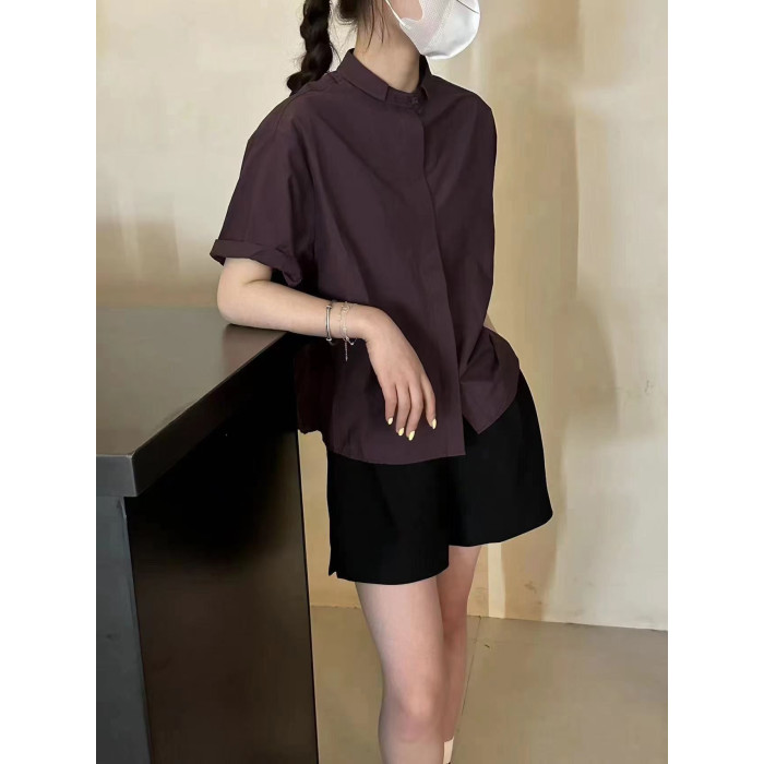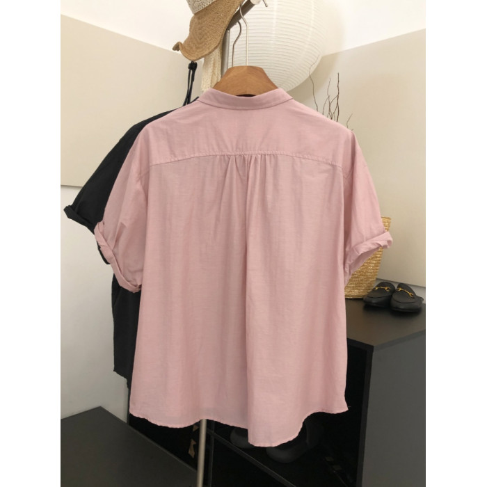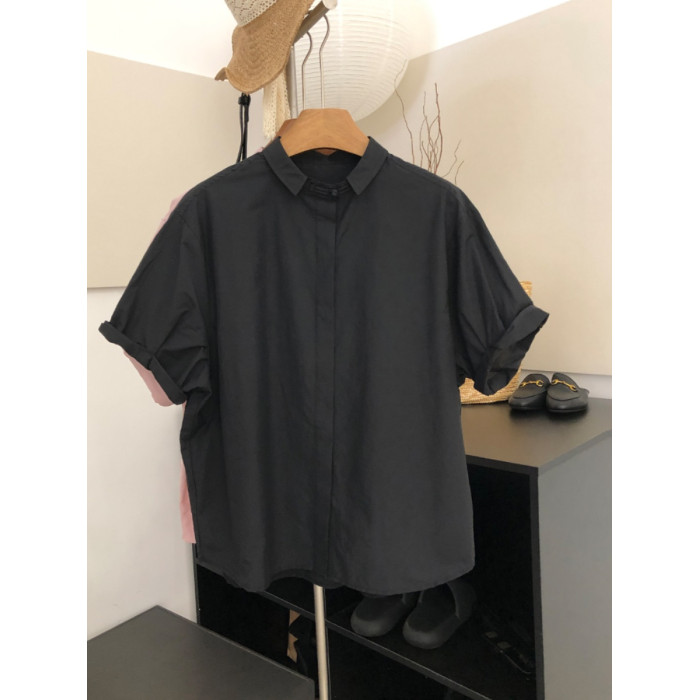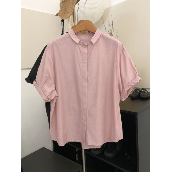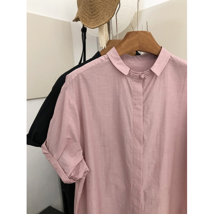 D壹 8805休閒簡約輕國風盤釦襯衫夏卷邊短袖薄天絲女襯衣寬松上衣