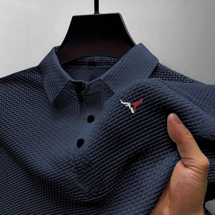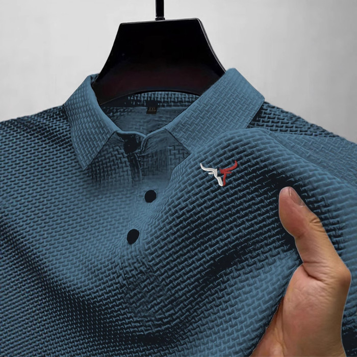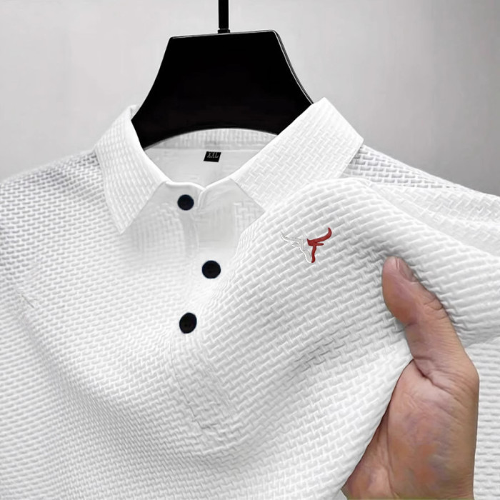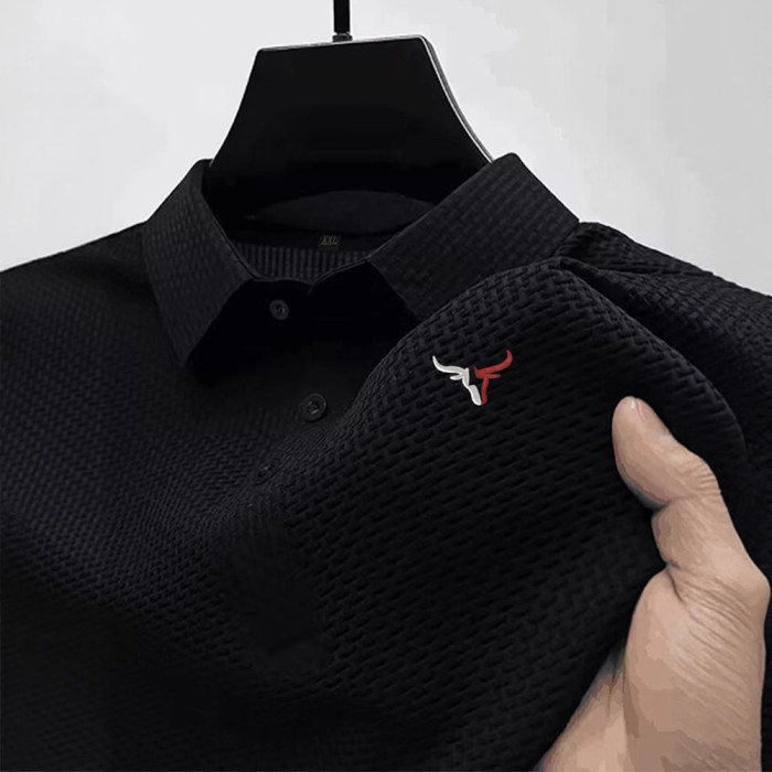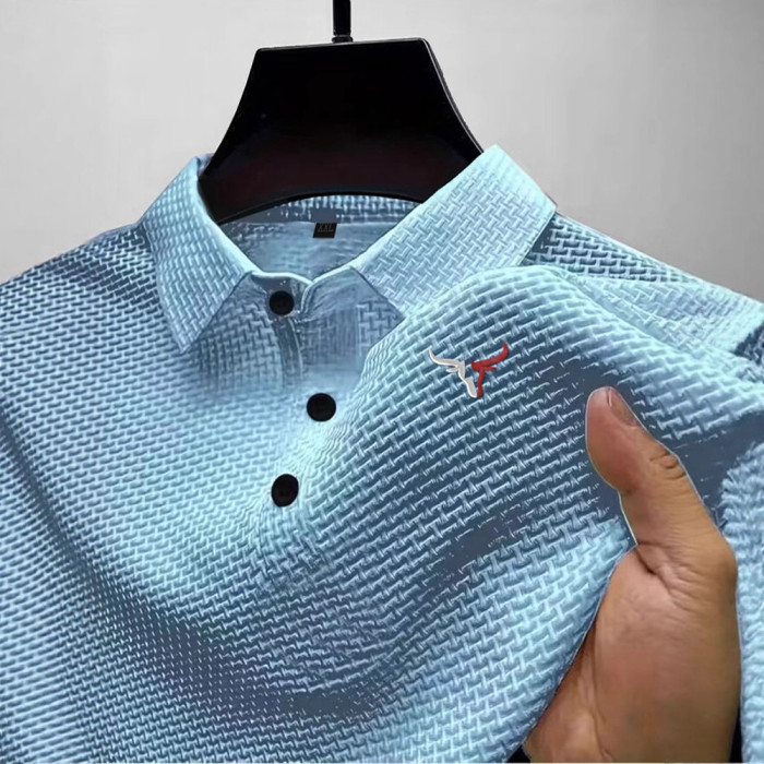 新款夏t恤短袖短袖高級網眼冰絲短袖t恤男襯衫領夏季純色牛頭印花