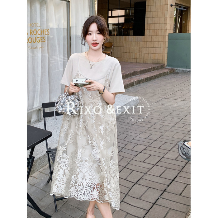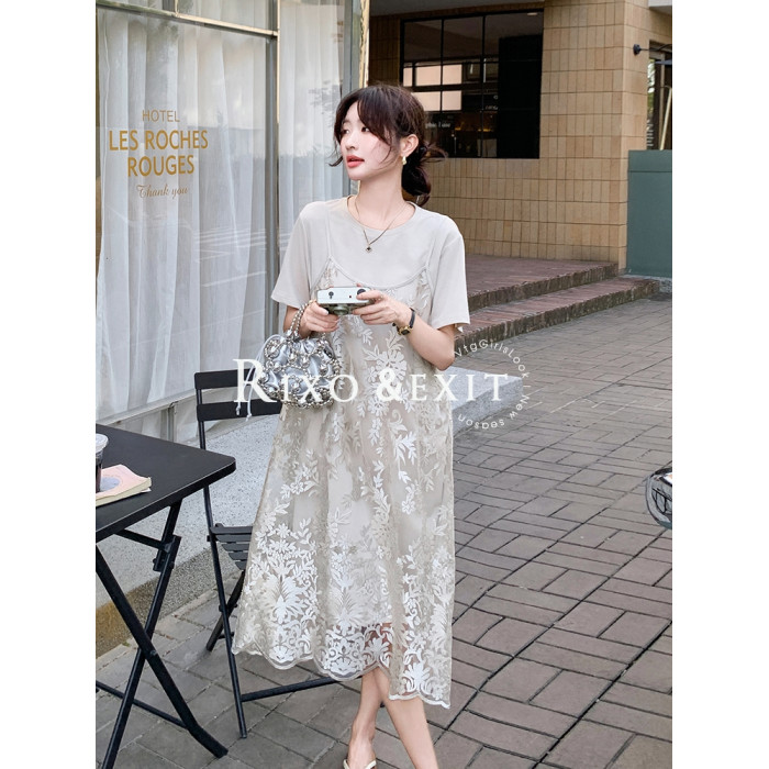 RIXO EXIT法式提花蕾絲吊帶衫t恤裙兩件套女夏新氣質減齡時髦套裝