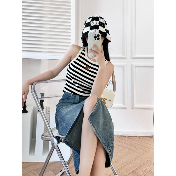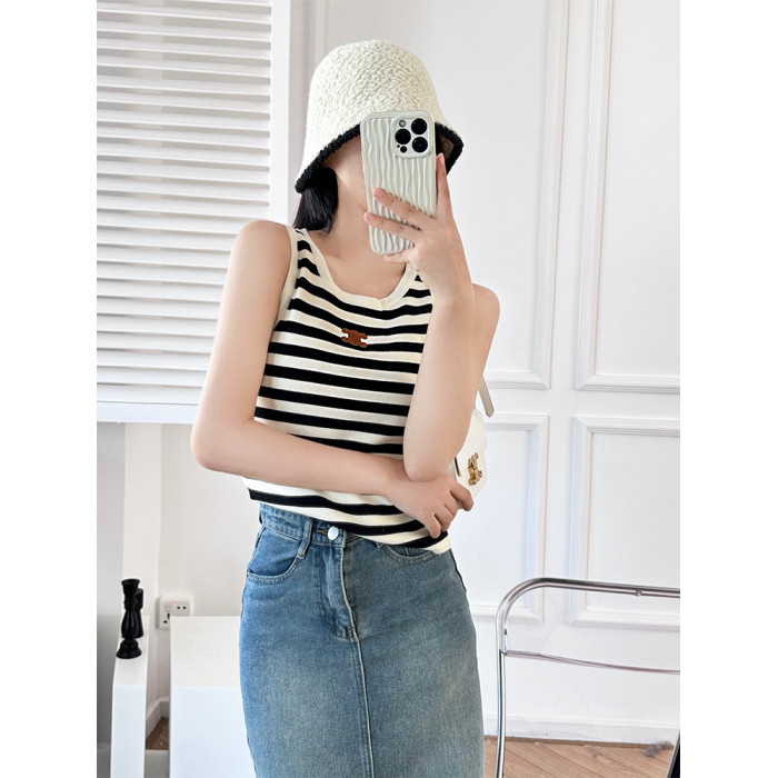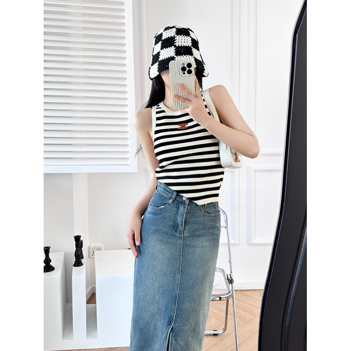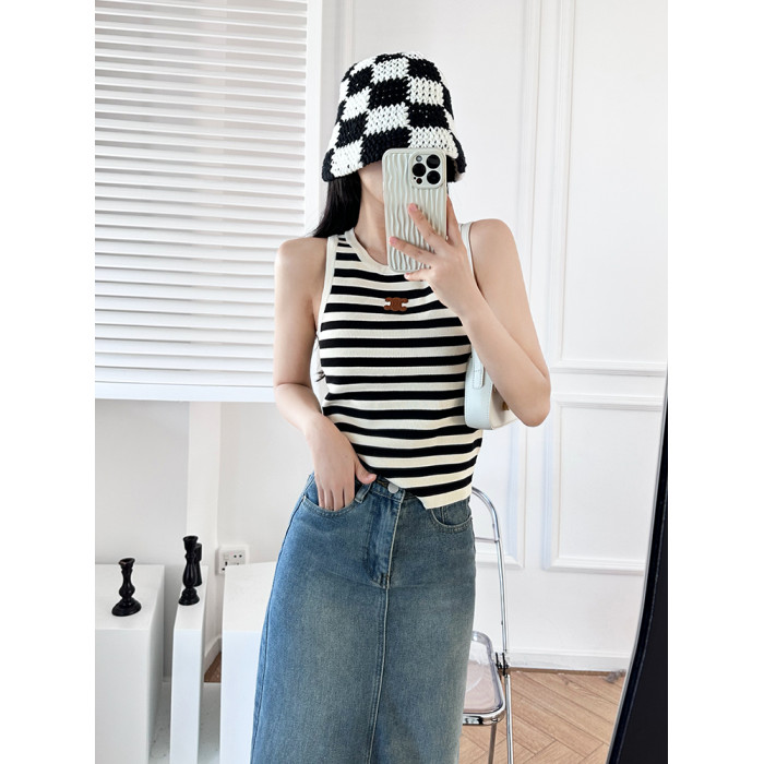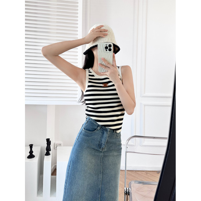 陳噗噗mn!復古凱旋門皮標裝飾修身條紋背心女夏季清涼針織吊帶衫