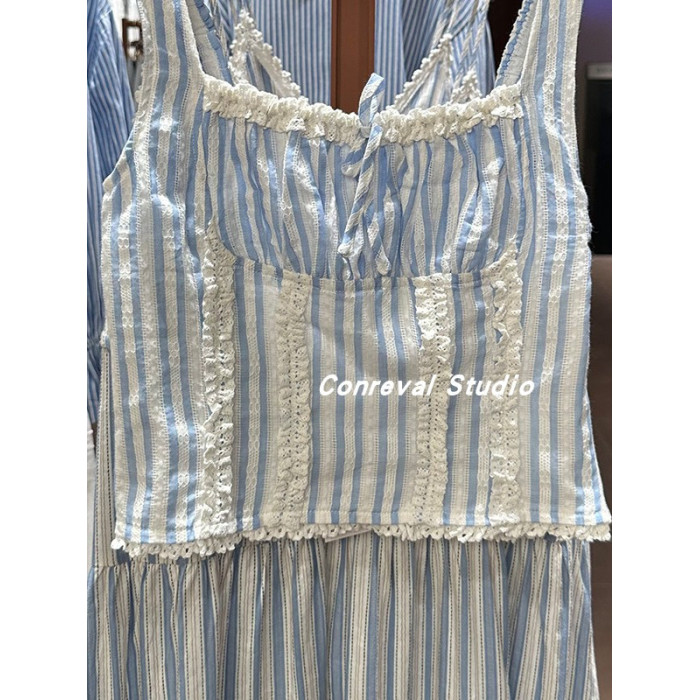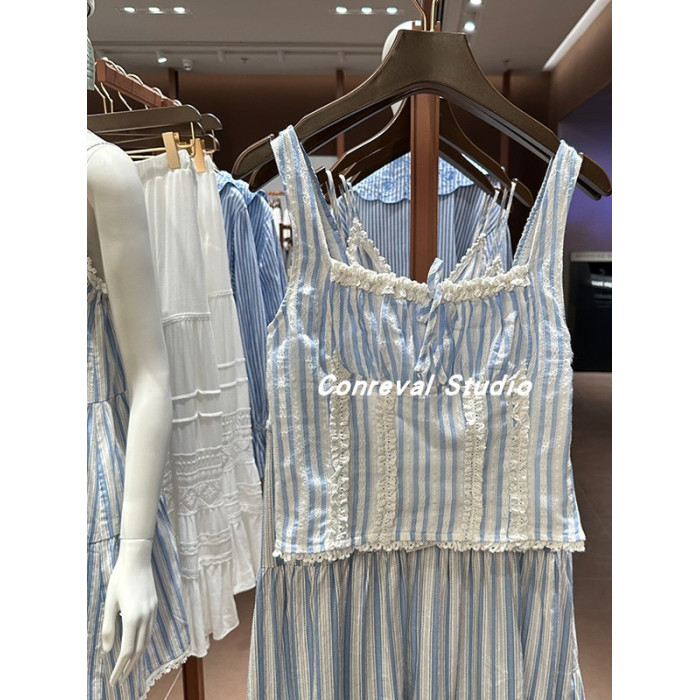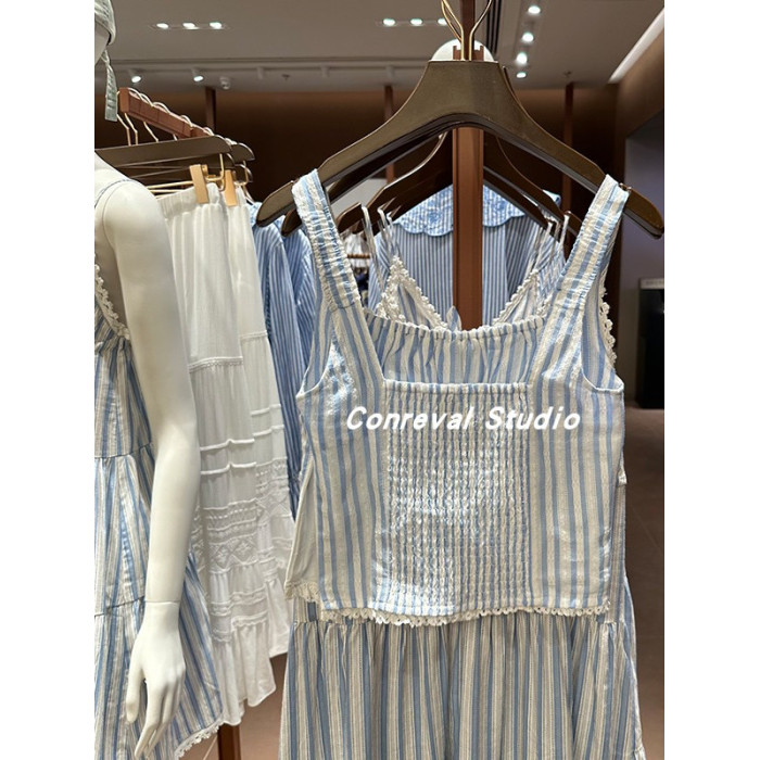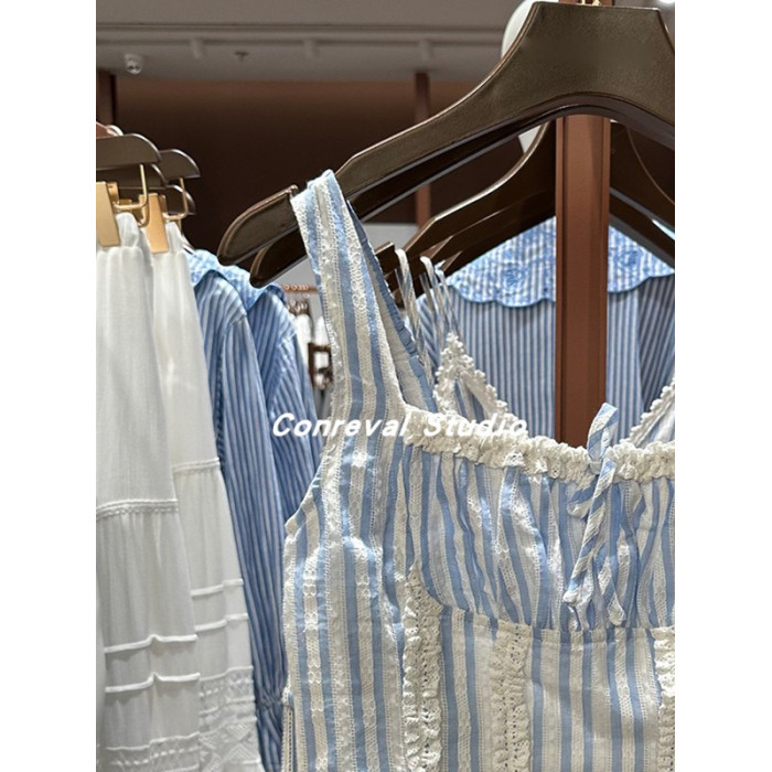 SH&UR2025夏季新款女裝甜美拼接蕾絲竪條紋打攬吊帶衫短款上衣ins